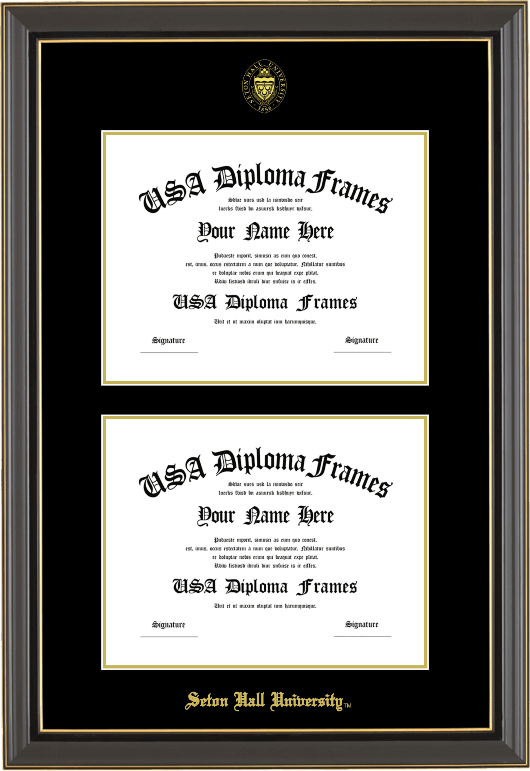 Seton Hall University Double Diploma Frame – Double Document – Black Gold Trim Glossy – Black and Gold Mat