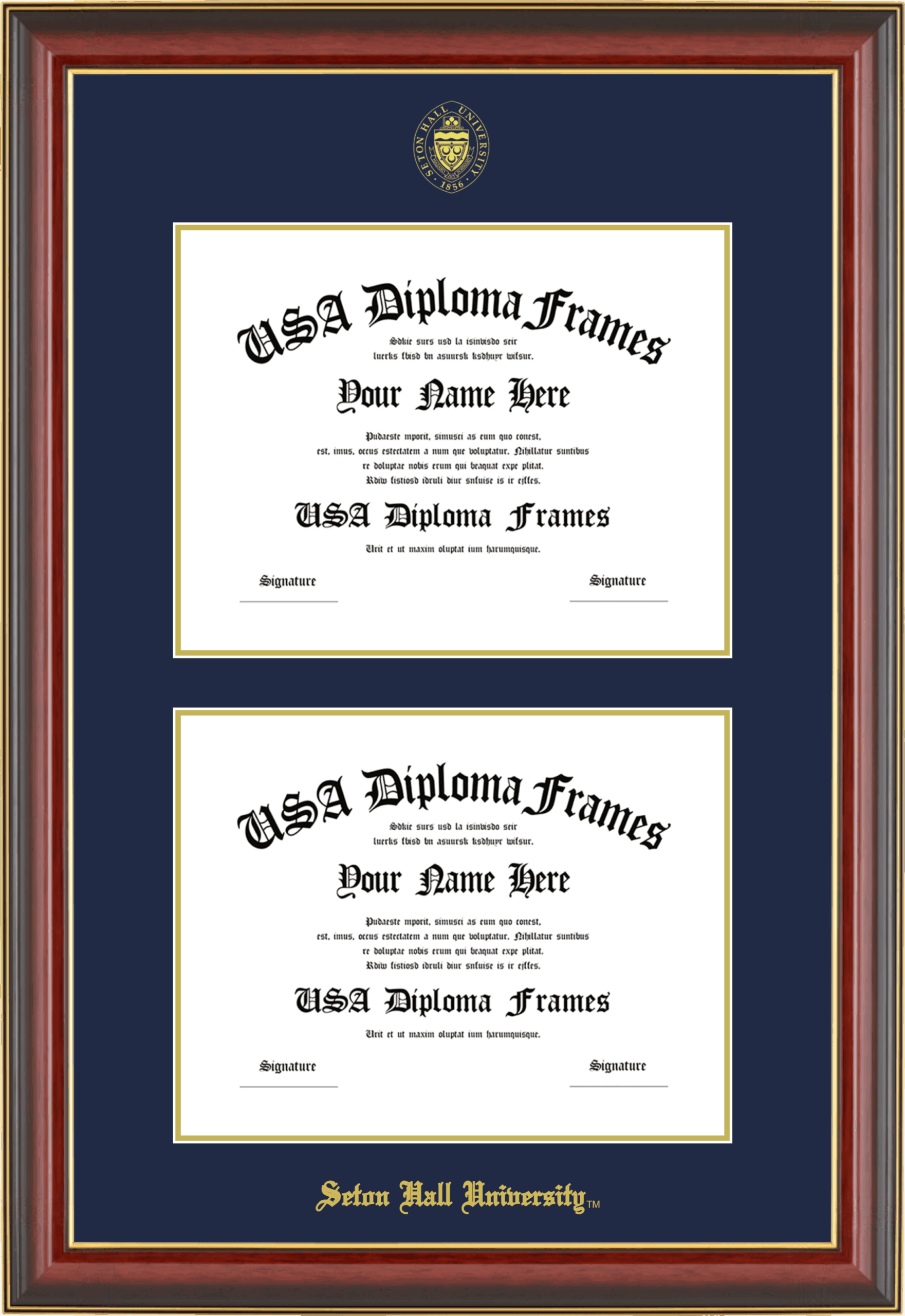 Seton Hall University Double Diploma Frame – Double Document – Cherry Mahogany Gold Trim Glossy – Navy and Gold Mat