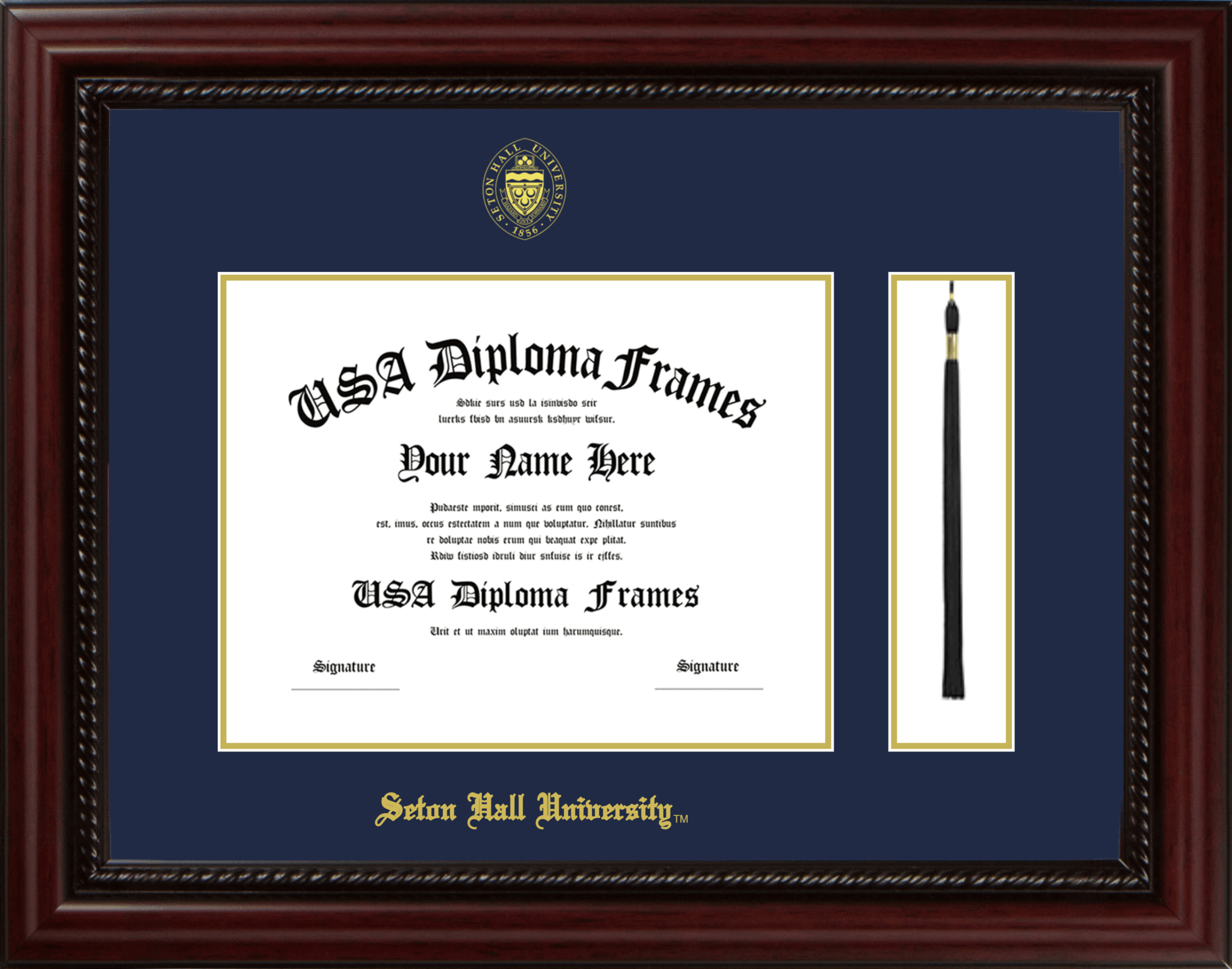 Seton Hall University Diploma Frame with Tassel – Executive Cherry Rope – Navy and Gold Mat