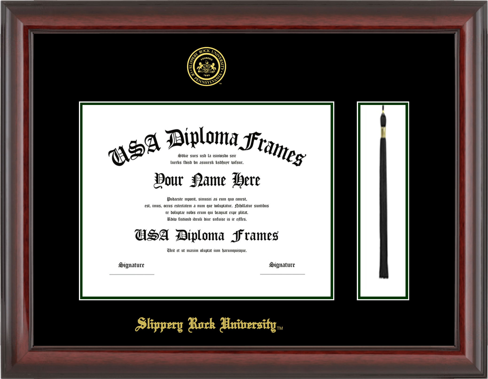 Slippery Rock University – Single Horizontal Document ( Diploma ) – Cherry Mahogany Glossy – Black Mat – Winter Green Accent Mat – With Tassel(Default) – With Seal(University Seal Gold) – With Gold Embossing (Slippery Rock University)