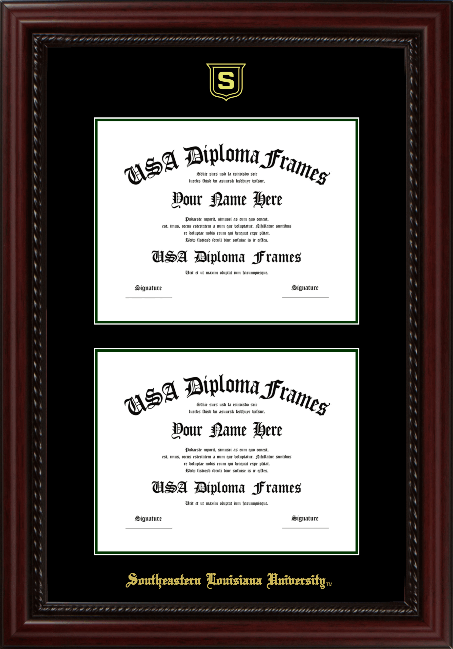 Southeastern Louisiana University Double Diploma Frame – Double Document – Executive Cherry Rope – Black and Winter Green Mat