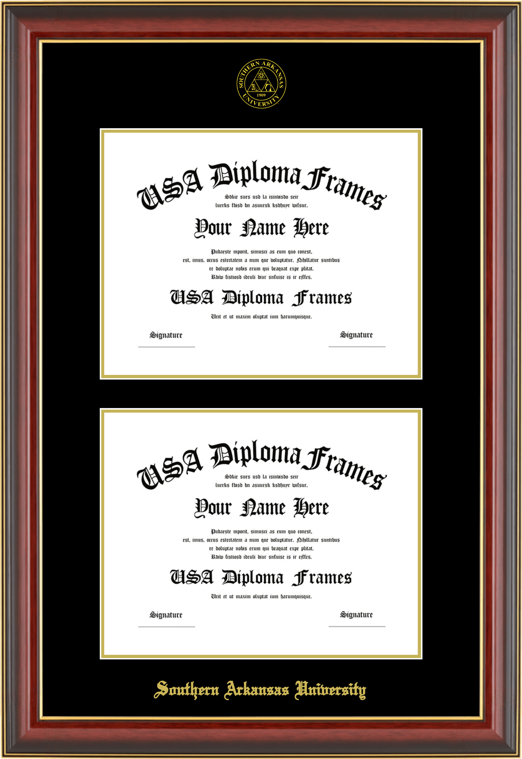 Southern Arkansas University Double Diploma Frame – Double Document – Cherry Mahogany Gold Trim Glossy – Black and Gold Mat