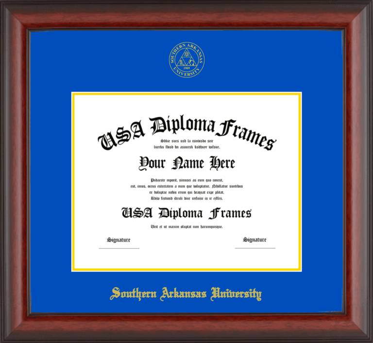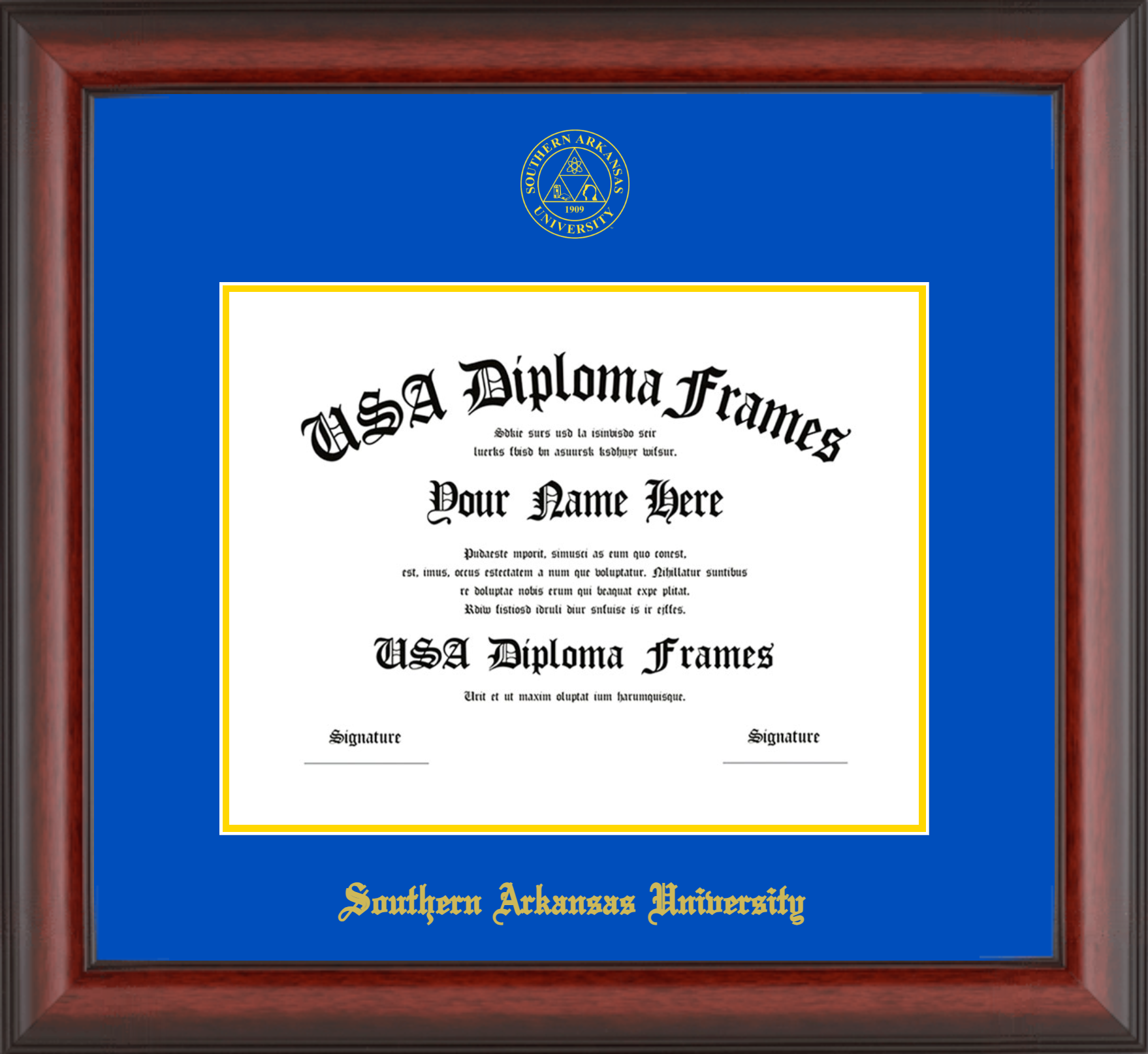 Southern Arkansas University Diploma Frame – Cherry Mahogany Matte – Royal Blue and Yellow Gold Mat