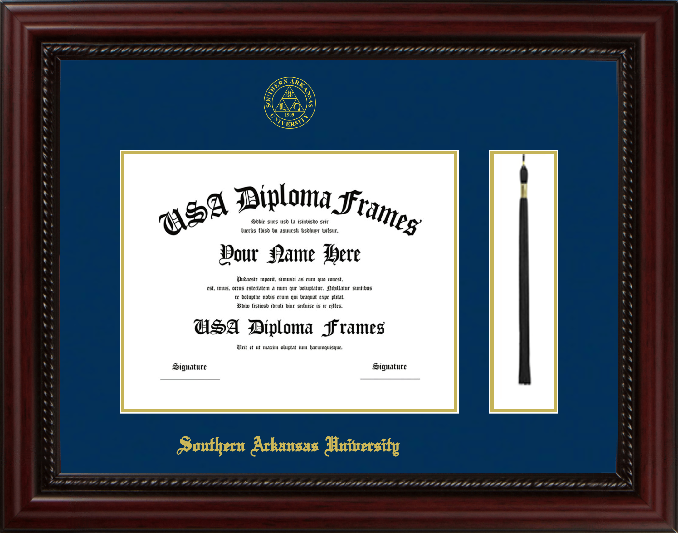 Southern Arkansas University Diploma Frame with Tassel – Executive Cherry Rope – Navy and Gold Mat