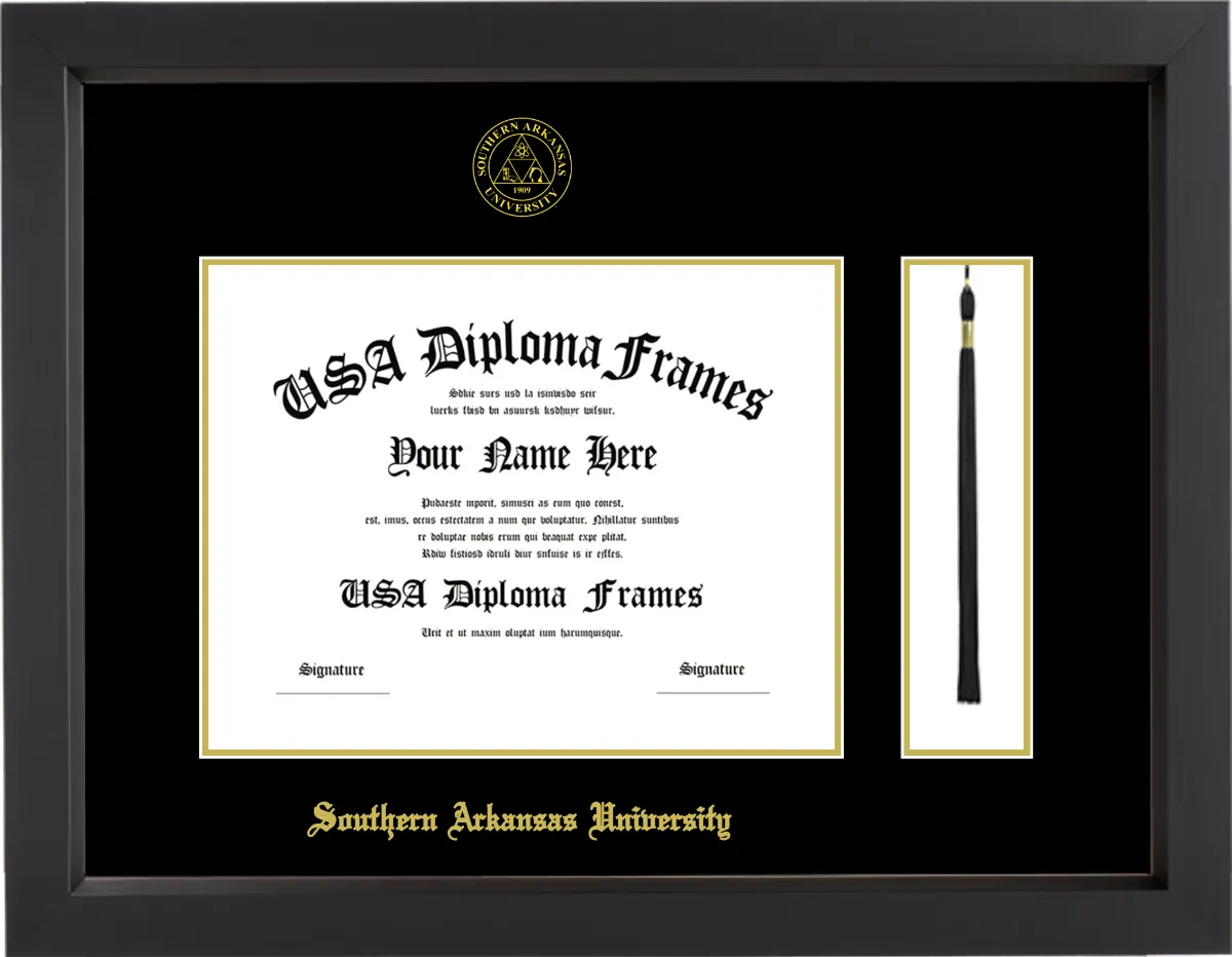 Southern Arkansas University – Single Horizontal Document ( Diploma ) – Black Matte – Black Mat – Gold Accent Mat – With Tassel(Default) – With Seal(University Seal Gold) – With Gold Embossing (Southern Arkansas University)
