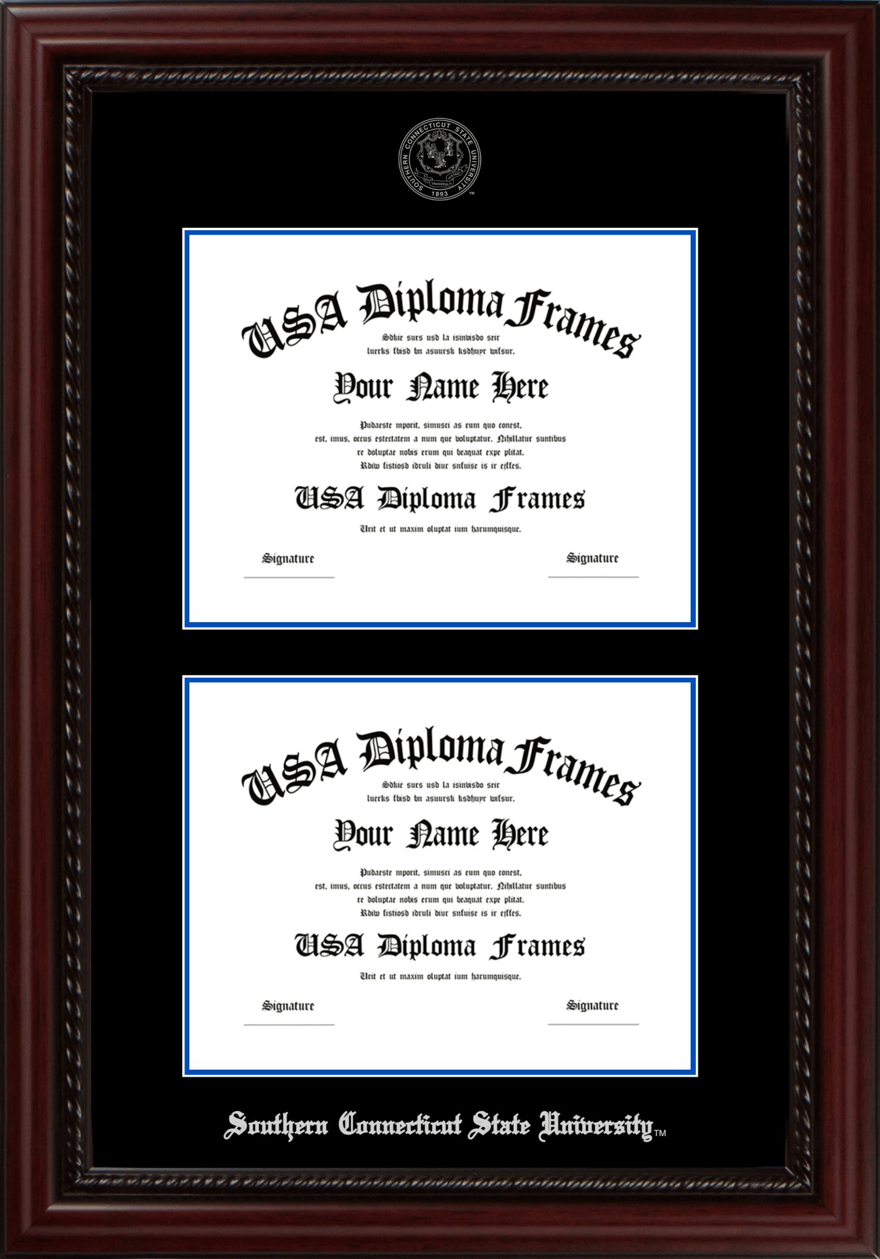 Southern Connecticut State University Double Diploma Frame – Double Document – Executive Cherry Rope – Black and Blue Mat