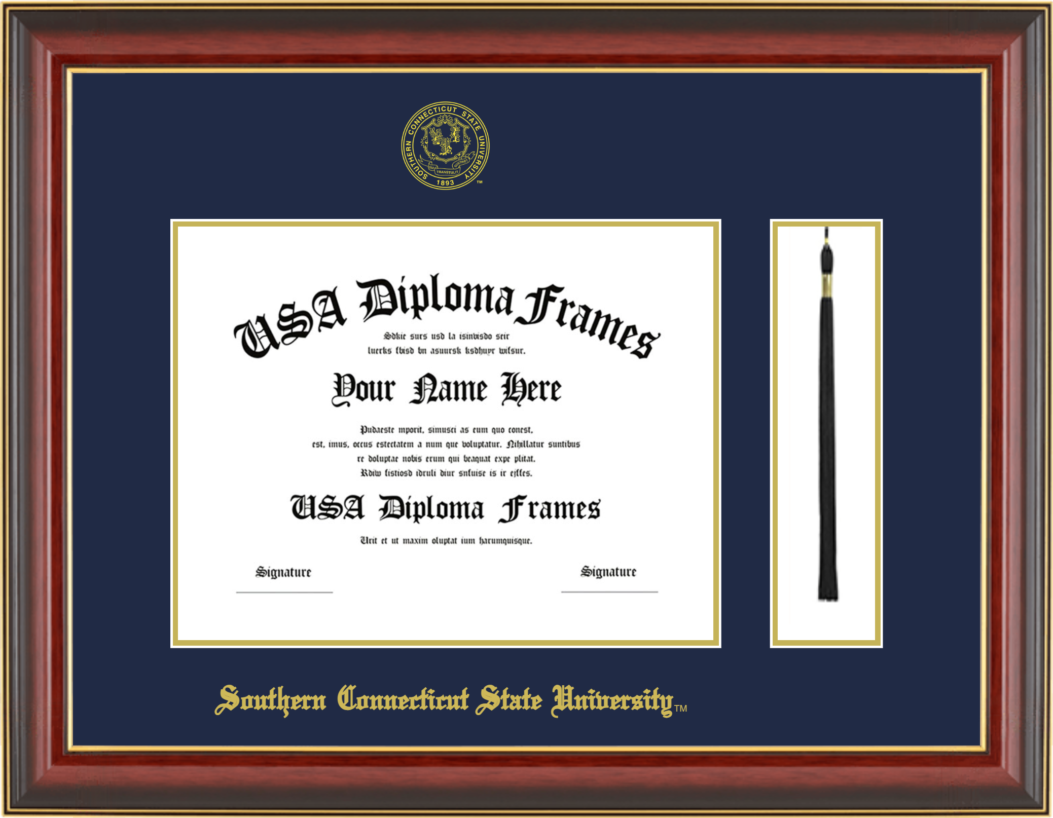 Southern Connecticut State University Diploma Frame with Tassel – Cherry Mahogany Gold Trim Glossy – Navy and Gold Mat