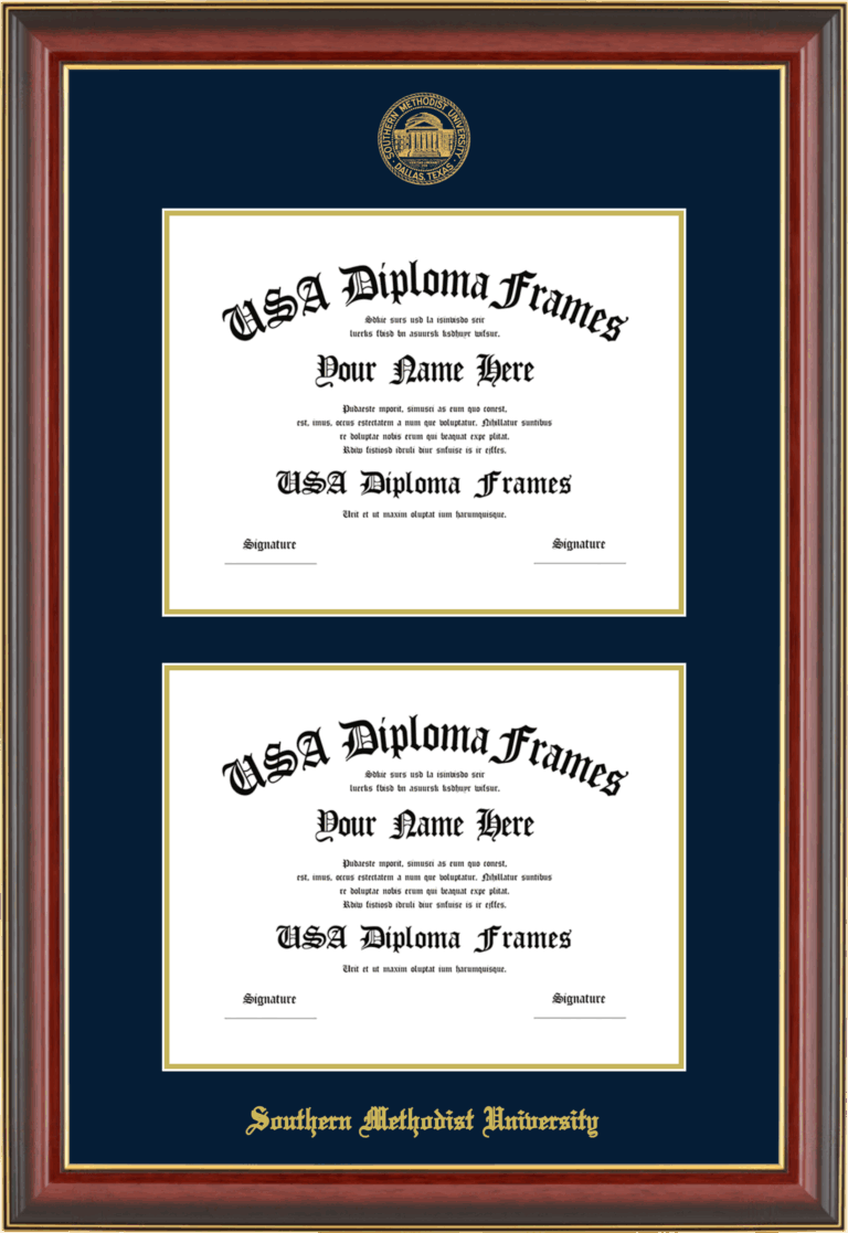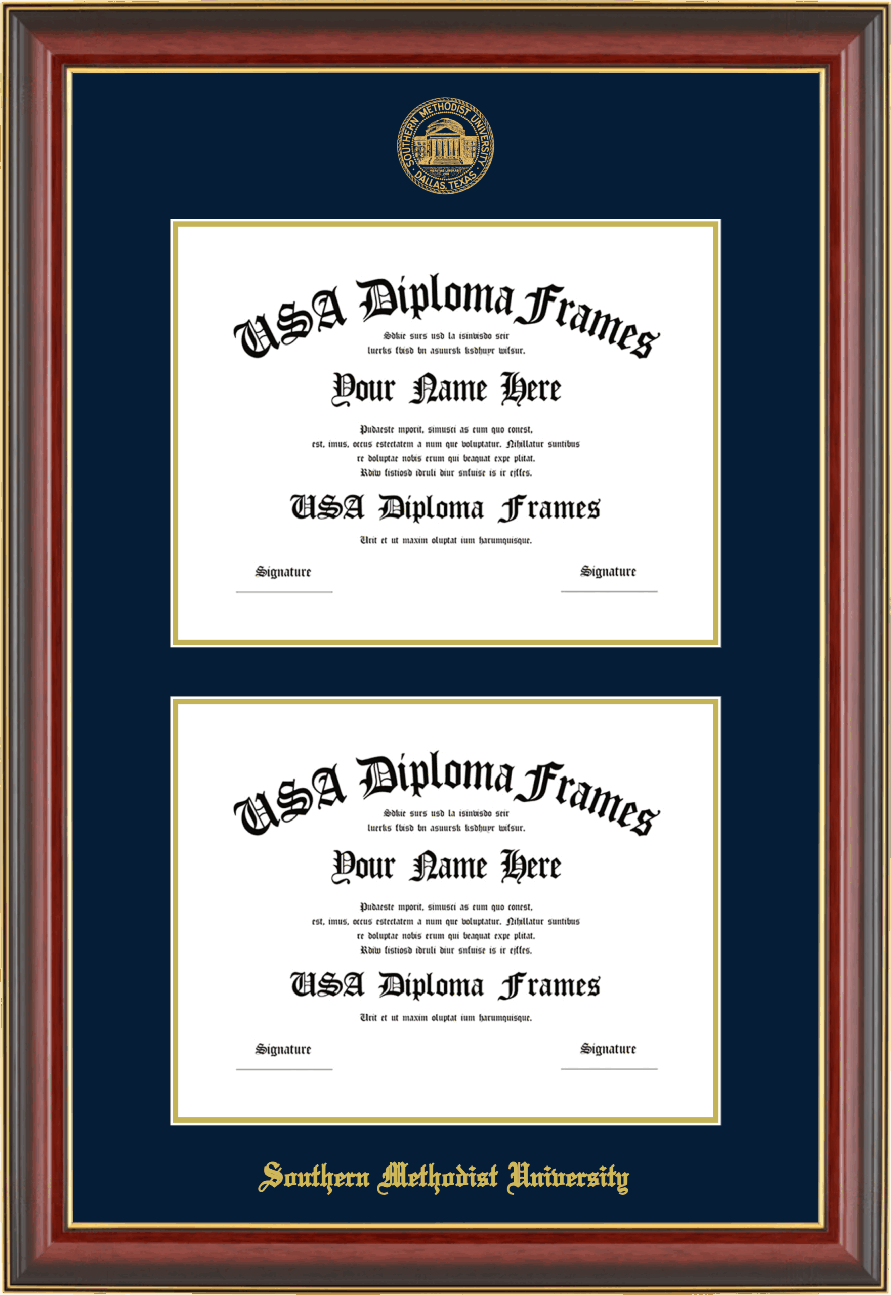 Southern Methodist University Double Diploma Frame – SMU Double Document – Cherry Mahogany Gold Trim Glossy – Navy and Gold Mat