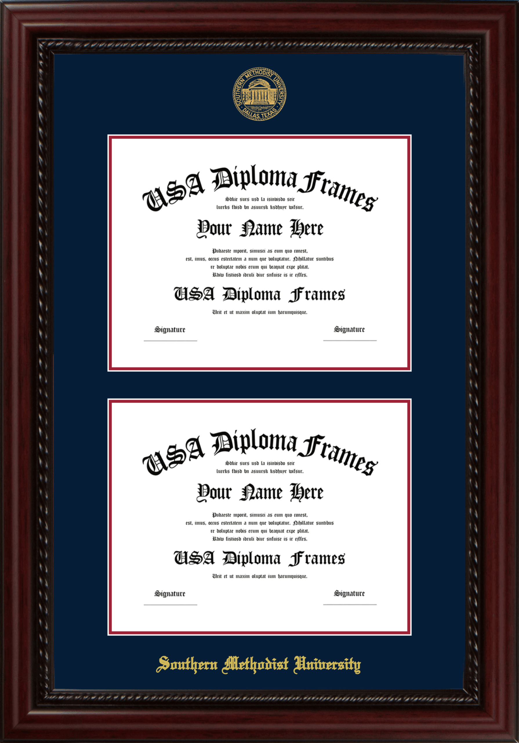 Southern Methodist University Double Diploma Frame – SMU Double Document – Executive Cherry Rope – Navy and Crimson Mat