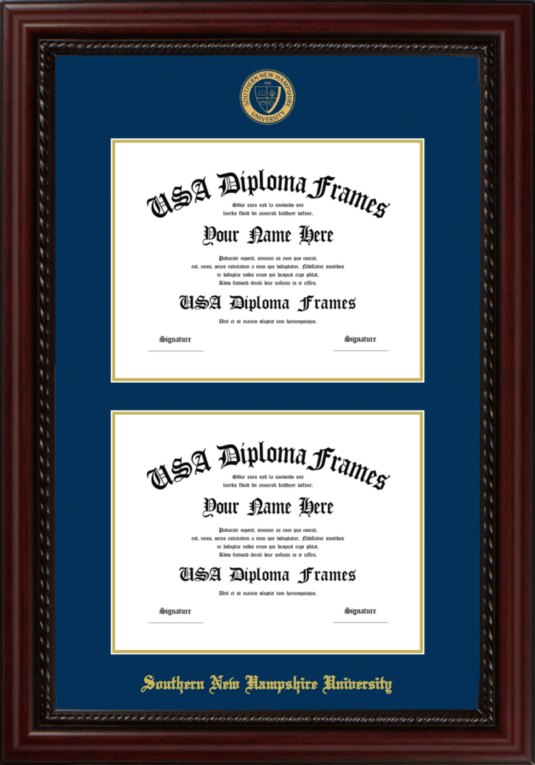 Southern New Hampshire University Double Diploma Frame – Double Document – Executive Cherry Rope – Navy and Gold Mat