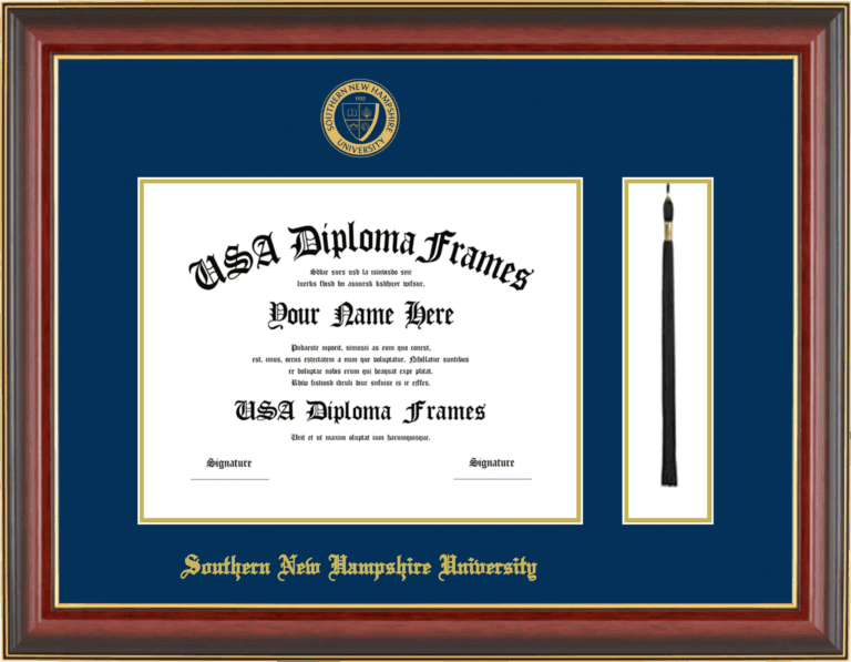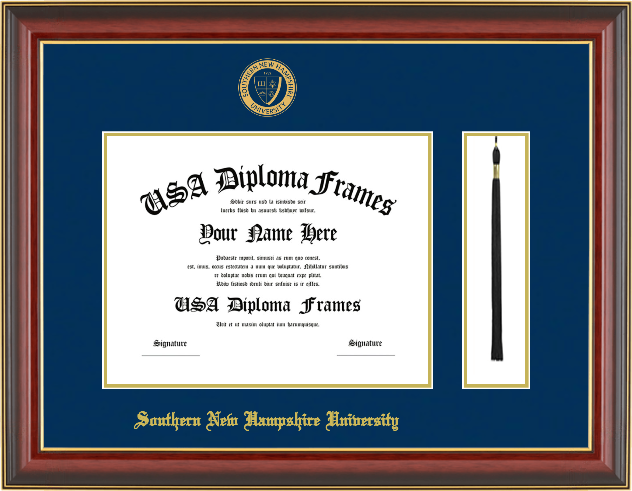 Southern New Hampshire University Diploma Frame with Tassel – Cherry Mahogany Gold Trim Glossy – Navy and Gold Mat