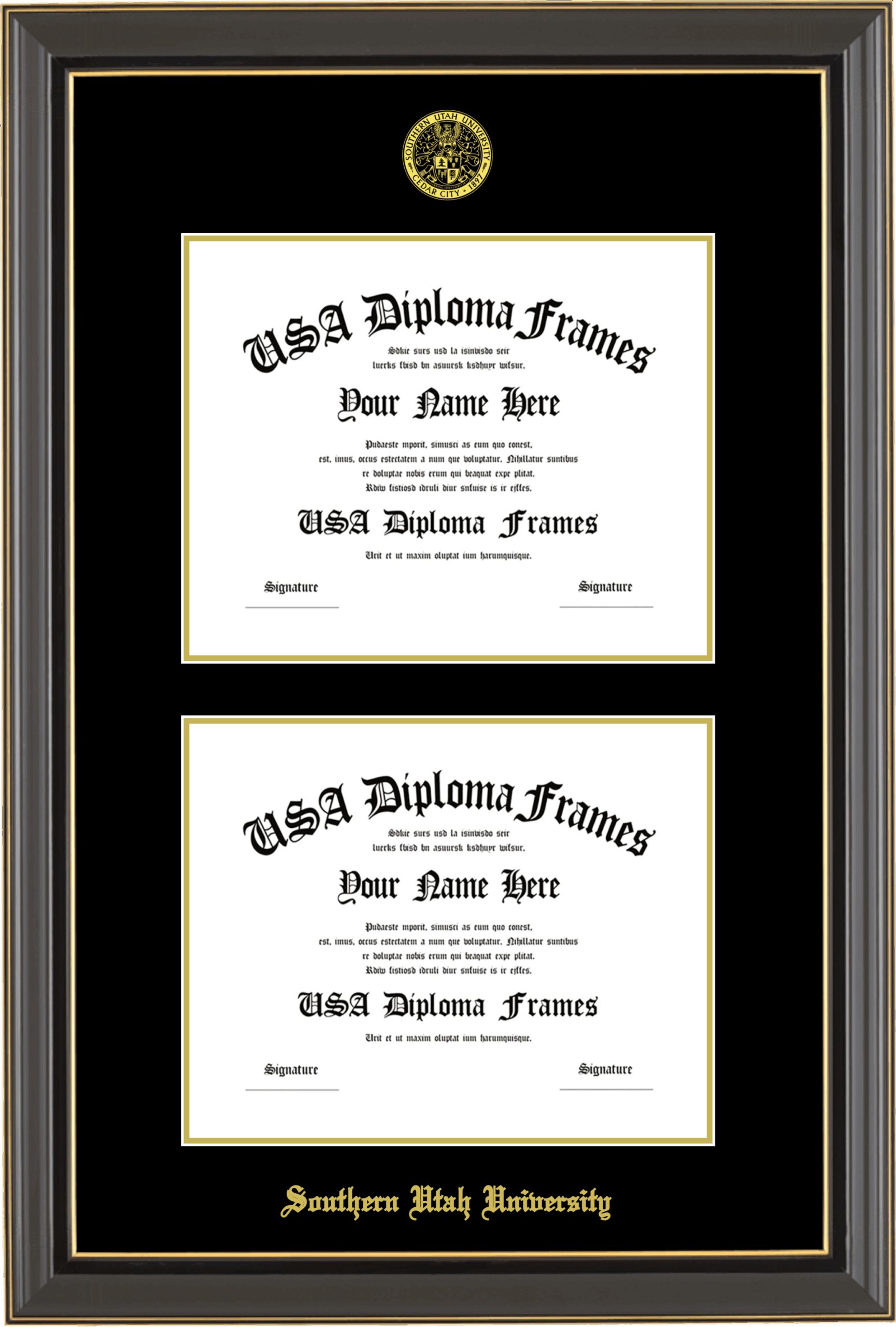 Southern Utah University Double Diploma Frame – Double Document – Black Gold Trim Glossy – Black and Gold Mat