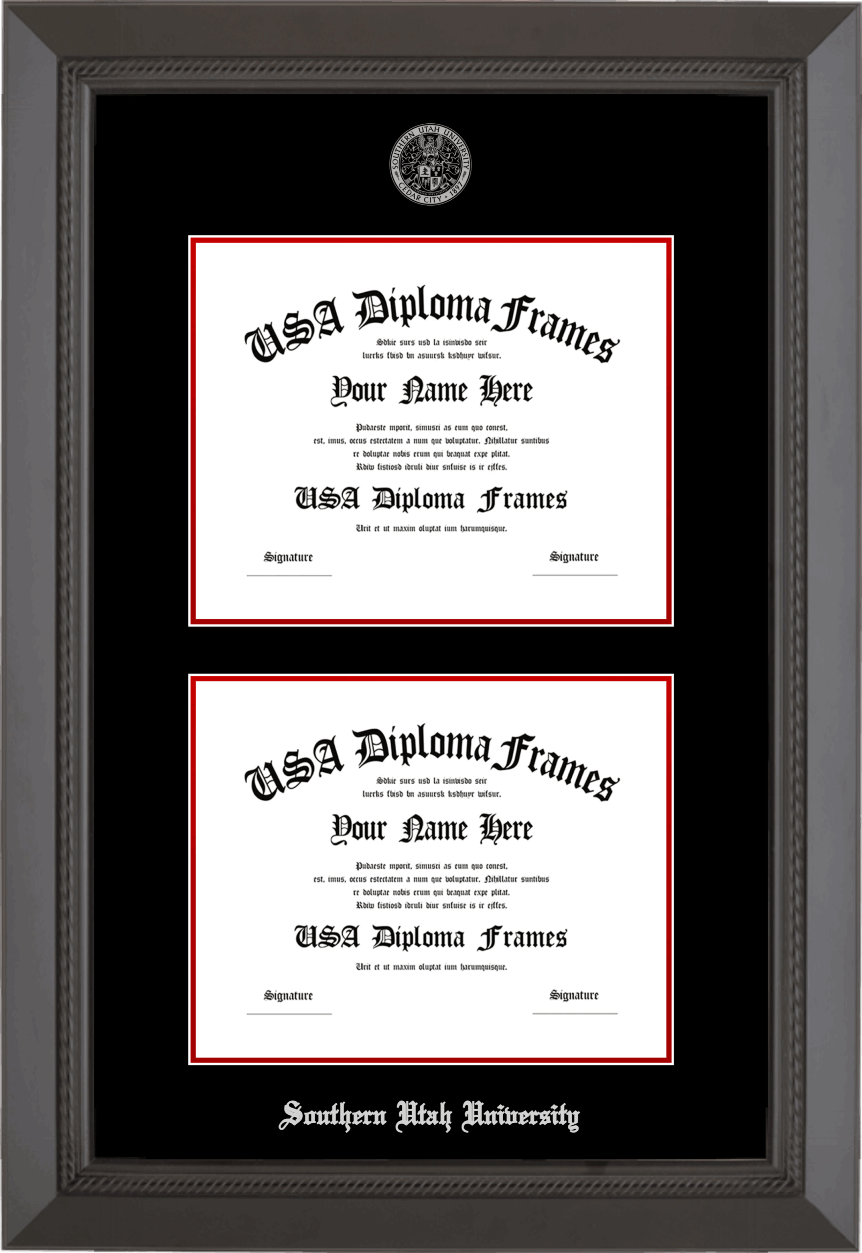 Southern Utah University Double Diploma Frame – Double Document – Black Rope – Black and Red Mat – Silver Seal