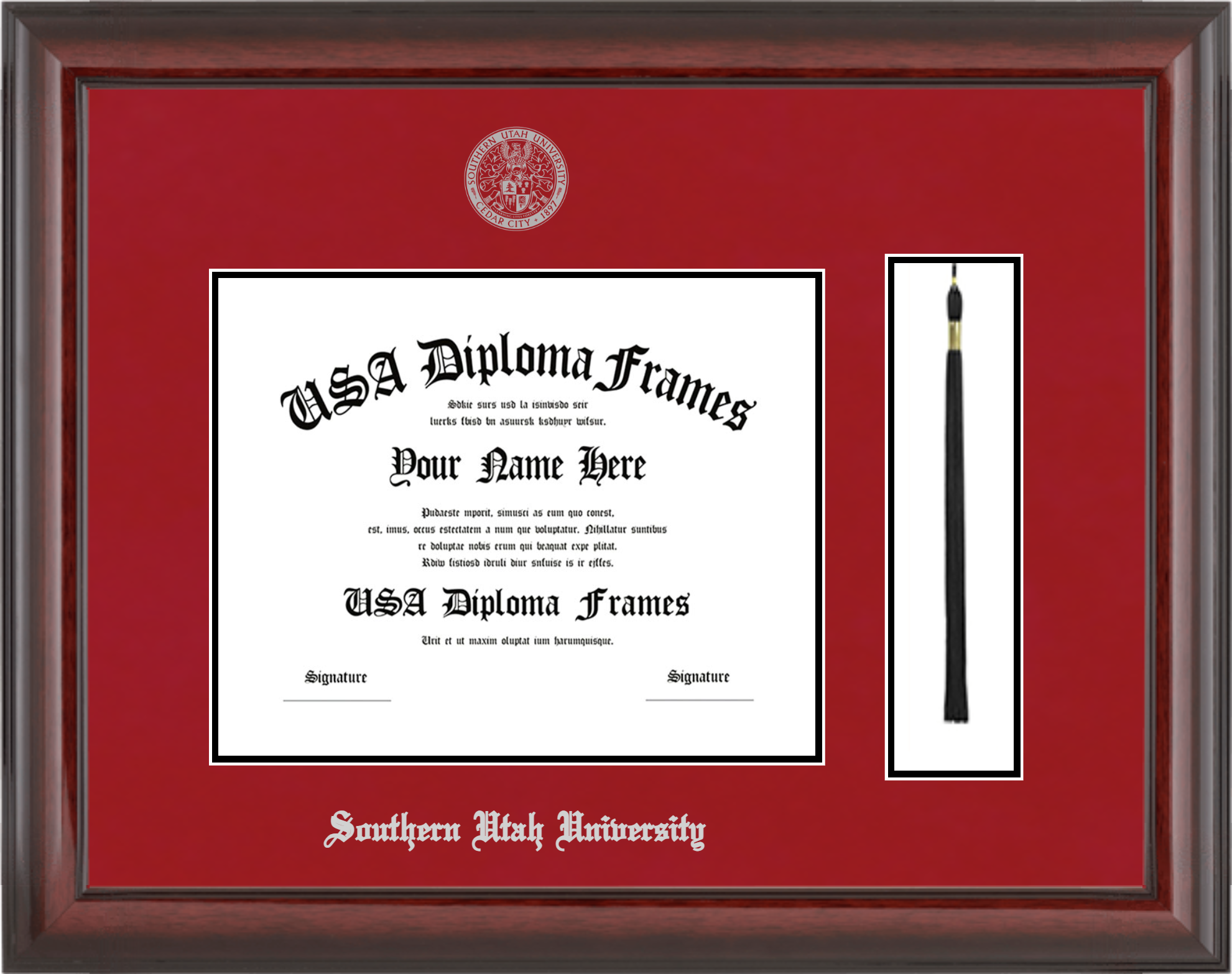 Southern Utah University Diploma Frame with Tassel – Cherry Mahogany Glossy – Crimson and Black Mat – Silver Seal