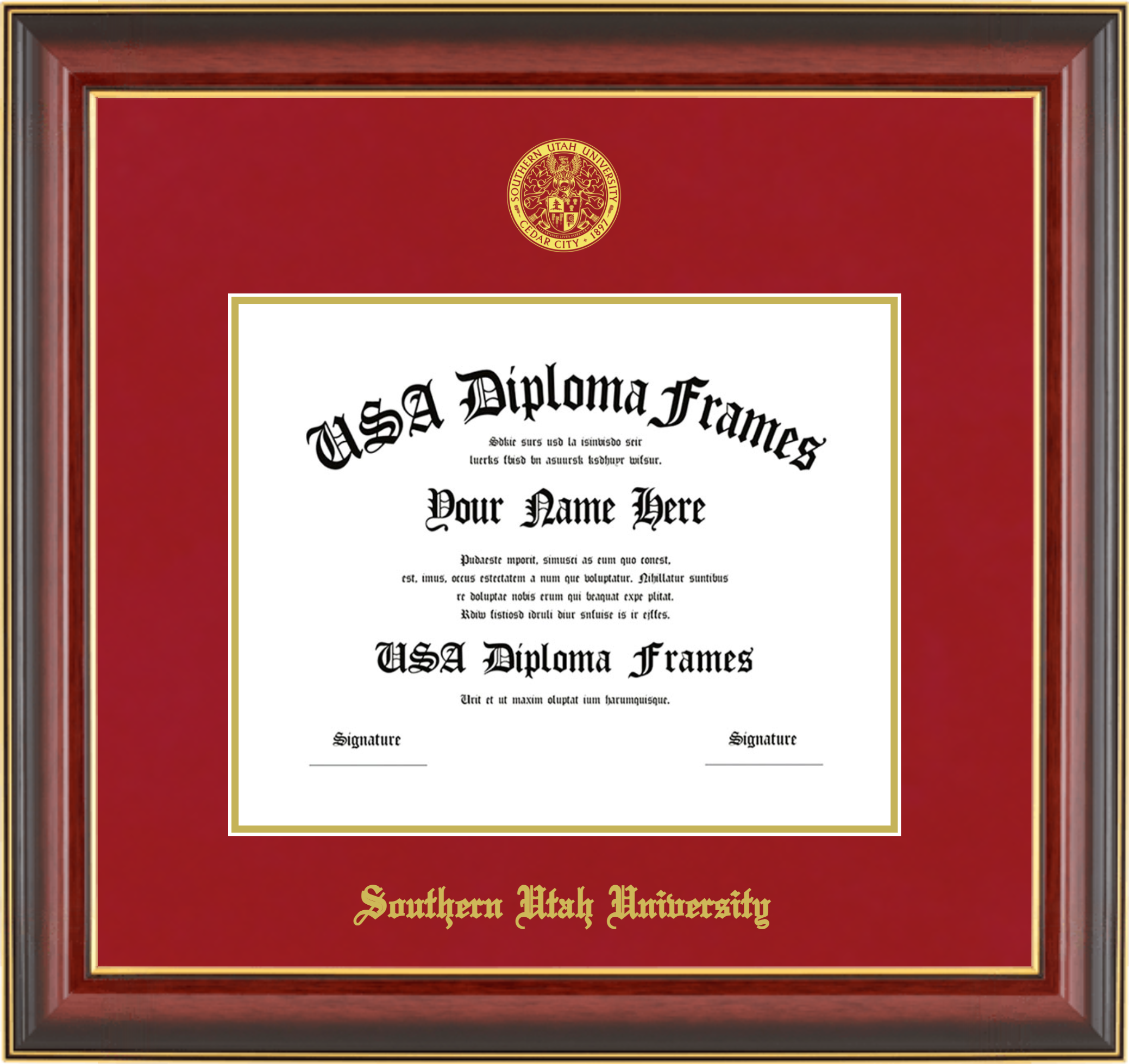 Southern Utah University – Single Horizontal Document ( Diploma ) – Cherry Mahogany Gold Trim Glossy – Crimson Mat – Gold Accent Mat – With Seal(University Seal Gold) – With Gold Embossing (Southern Utah University)