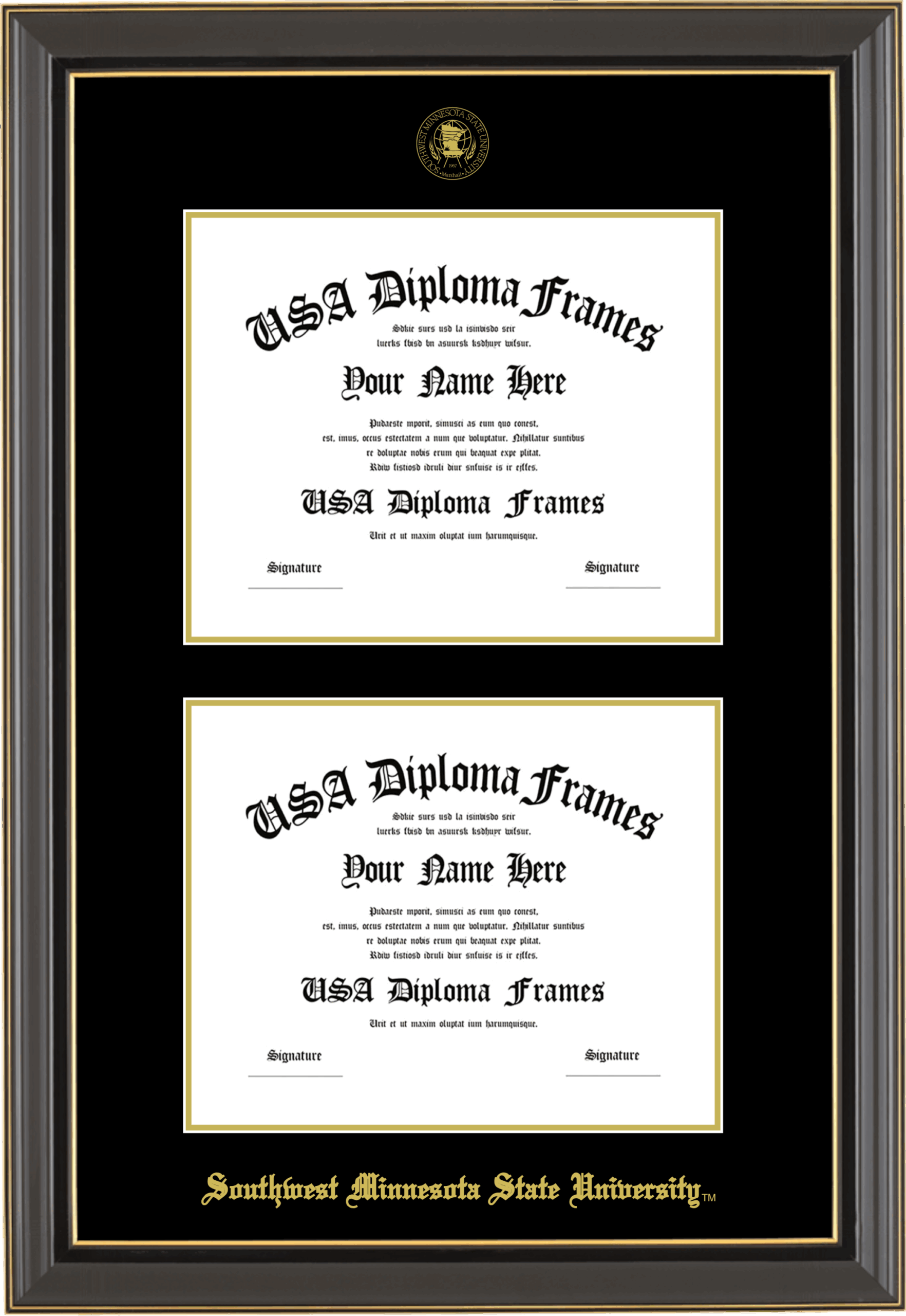 Southwest Minnesota State University Double Diploma Frame – Double Document – Black Gold Trim Glossy – Black and Gold Mat