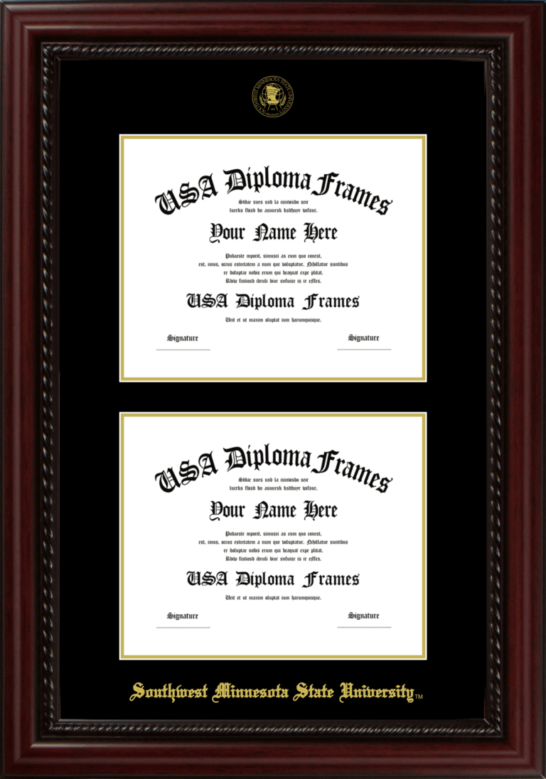 Southwest Minnesota State University Double Diploma Frame – Double Document – Executive Cherry Rope – Black and Gold Mat