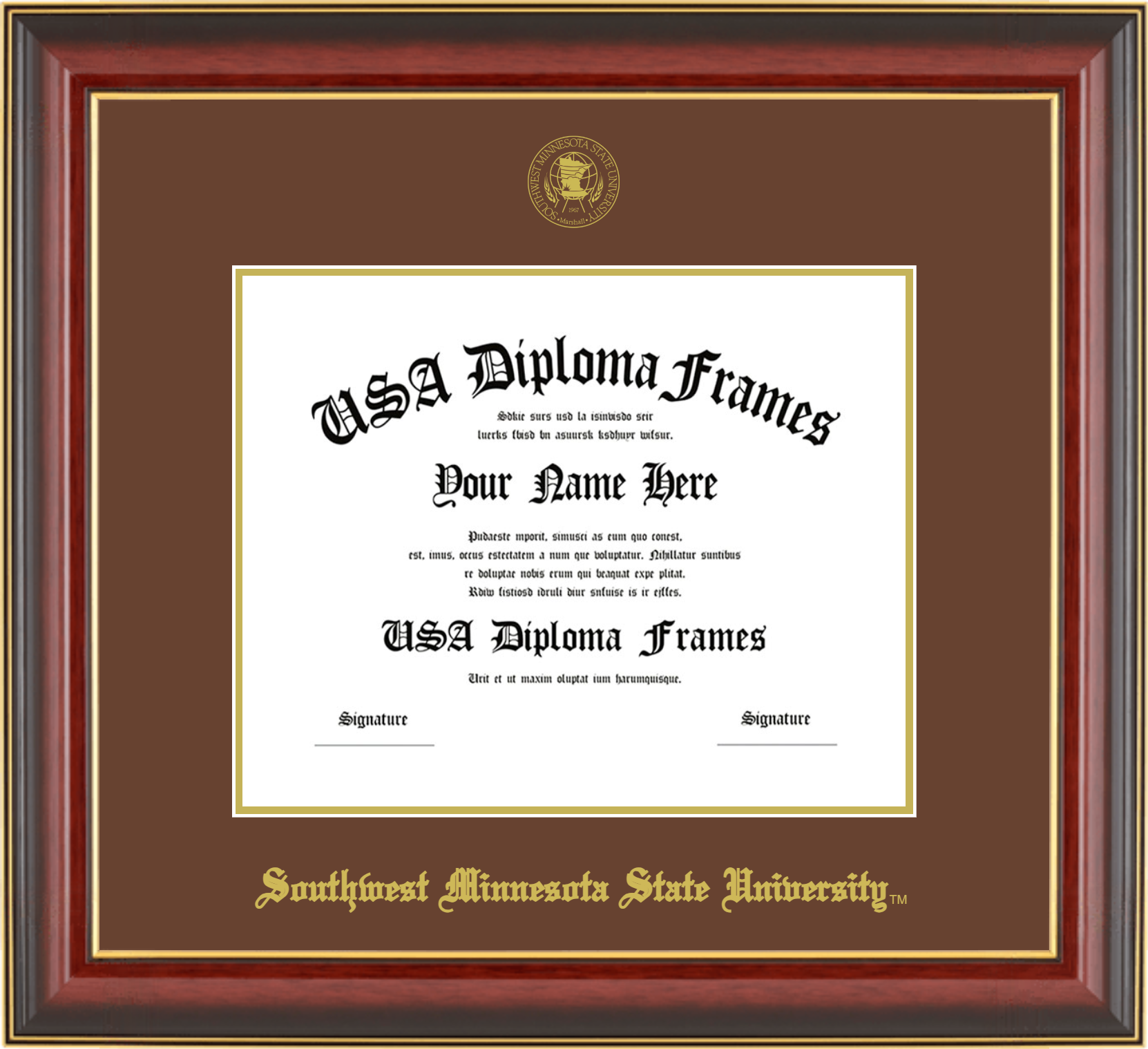 Southwest Minnesota State University Diploma Frame – Cherry Mahogany Gold Trim Glossy – Brown and Gold Mat