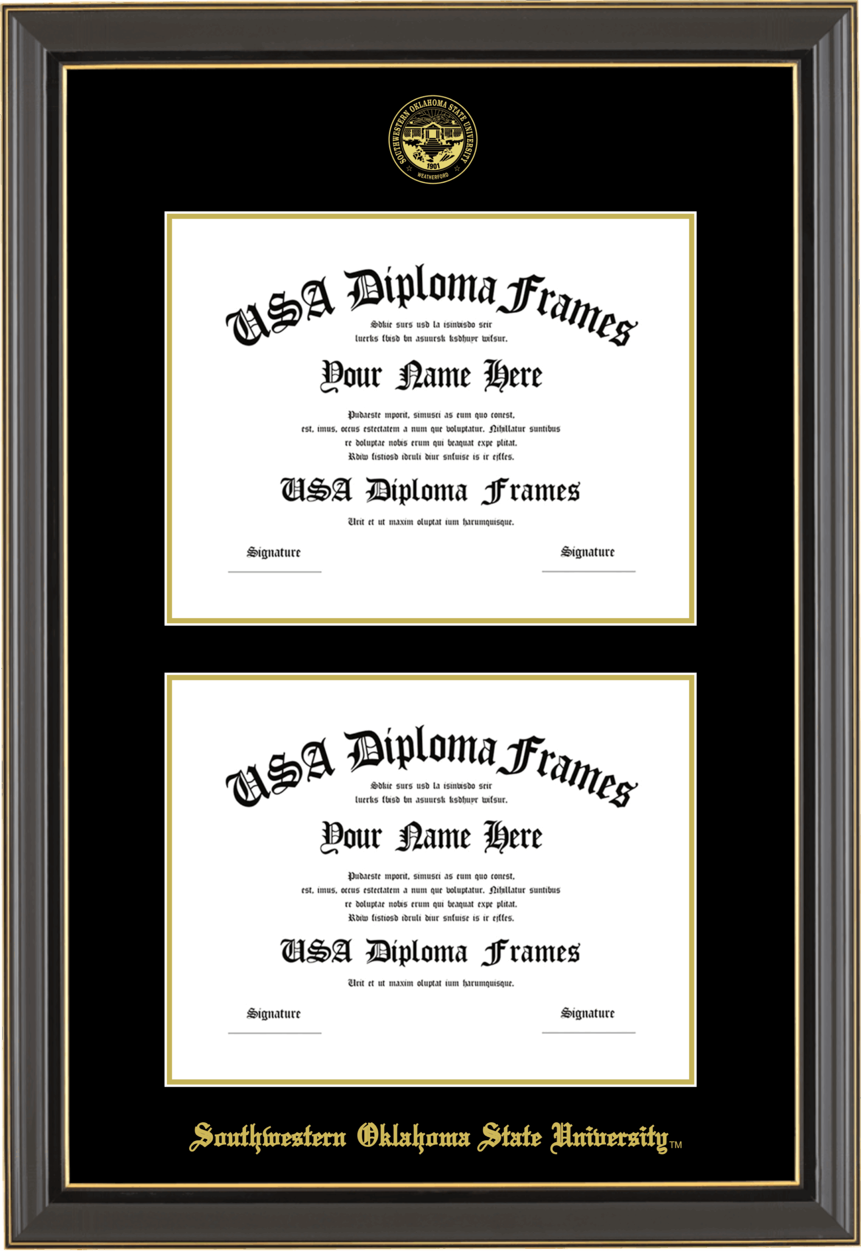 Southwestern Oklahoma State University Double Diploma Frame – Double Document – Black Gold Trim Glossy – Black and Gold Mat