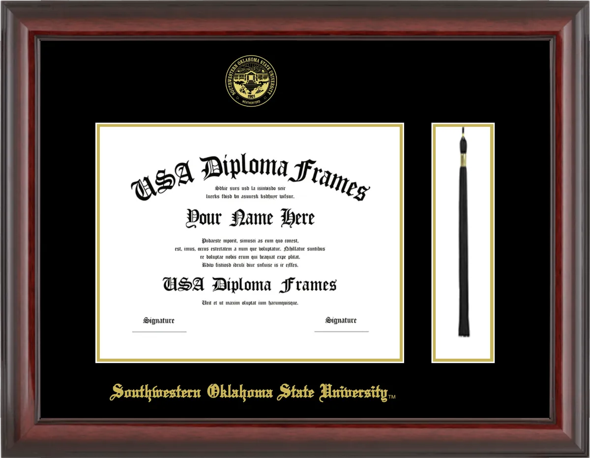 Southwestern Oklahoma State University – Single Horizontal Document ( Diploma ) – Cherry Mahogany Glossy – Black Mat – Gold Accent Mat – With Tassel(Default) – With Seal(University Seal Gold) – With Gold Embossing (Southwestern Oklahoma State University)