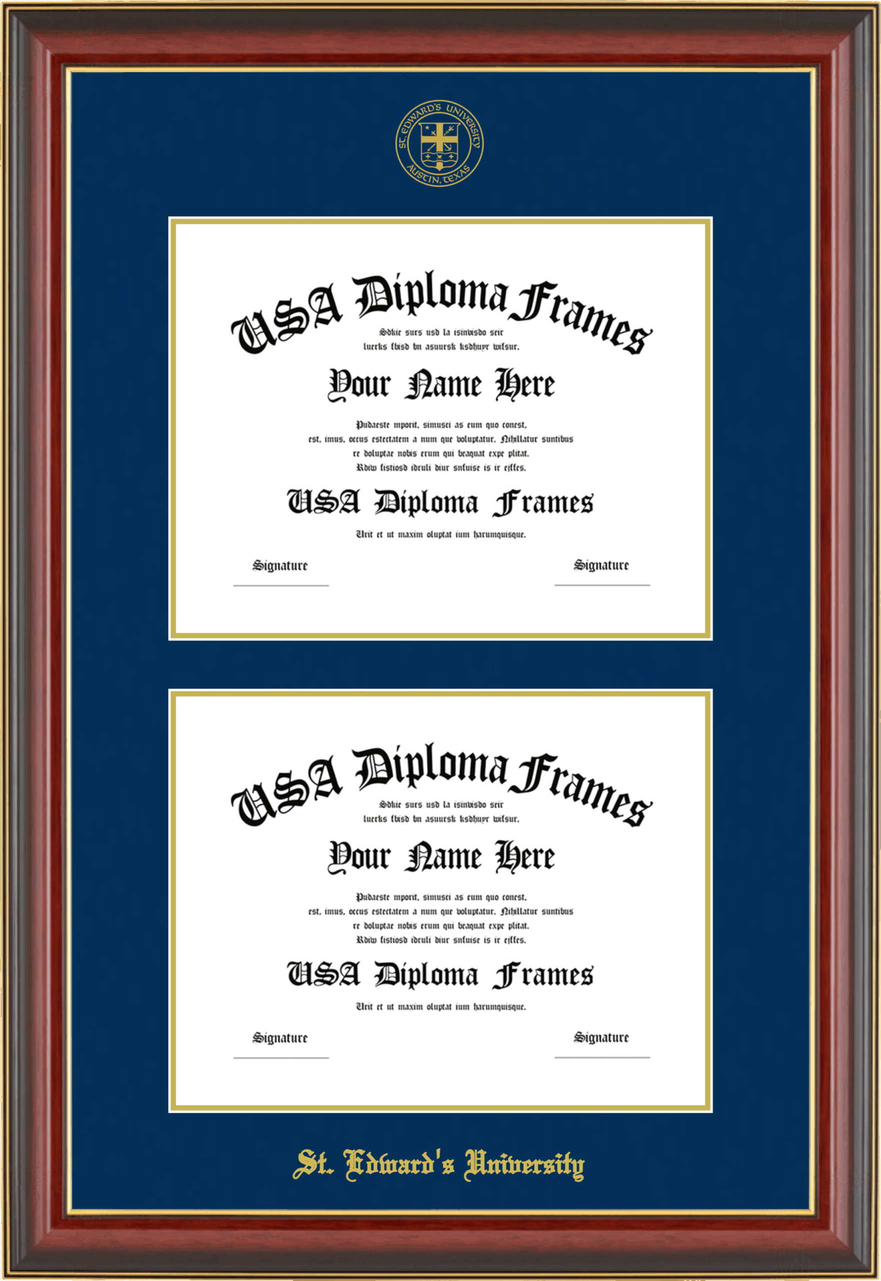 St. Edward’s University Double Diploma Frame – Double Document – Cherry Mahogany Gold Trim Glossy – Navy and Gold Mat