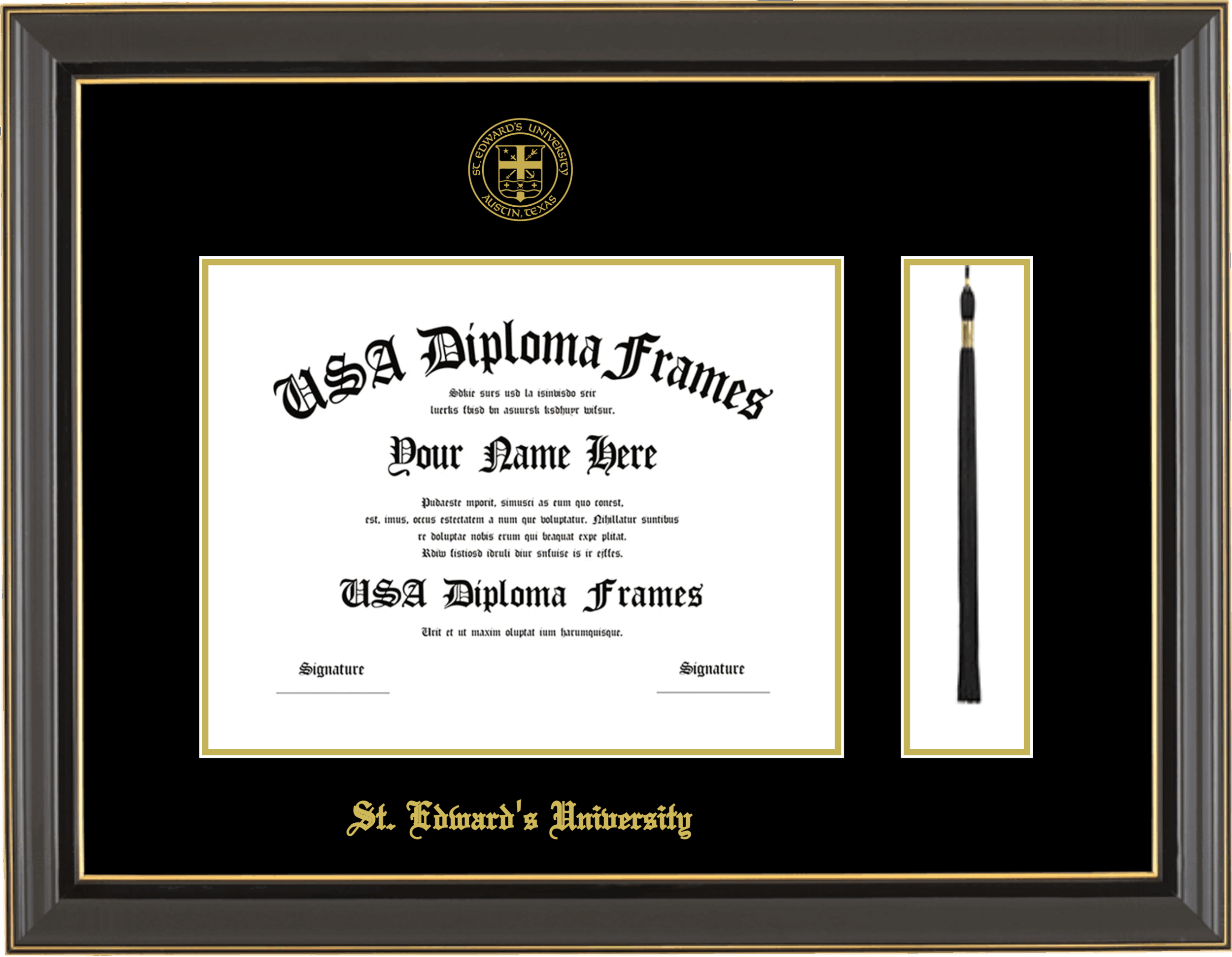 St. Edward’s University Diploma Frame with Tassel – Black Gold Trim Glossy – Black and Gold Mat