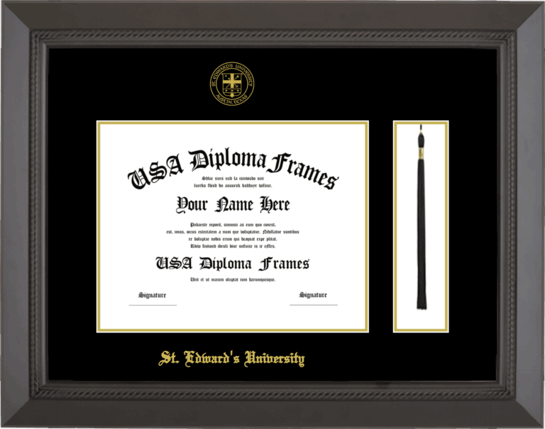 St. Edward’s University Diploma Frame with Tassel – Black Rope – Black and Gold Mat