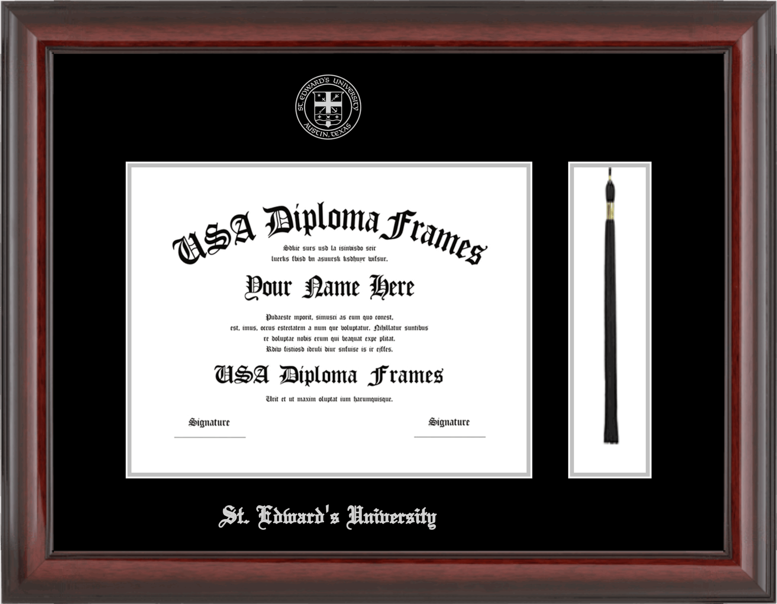 St. Edward’s University Diploma Frame with Tassel – Cherry Mahogany Glossy – Black and Silver Mat