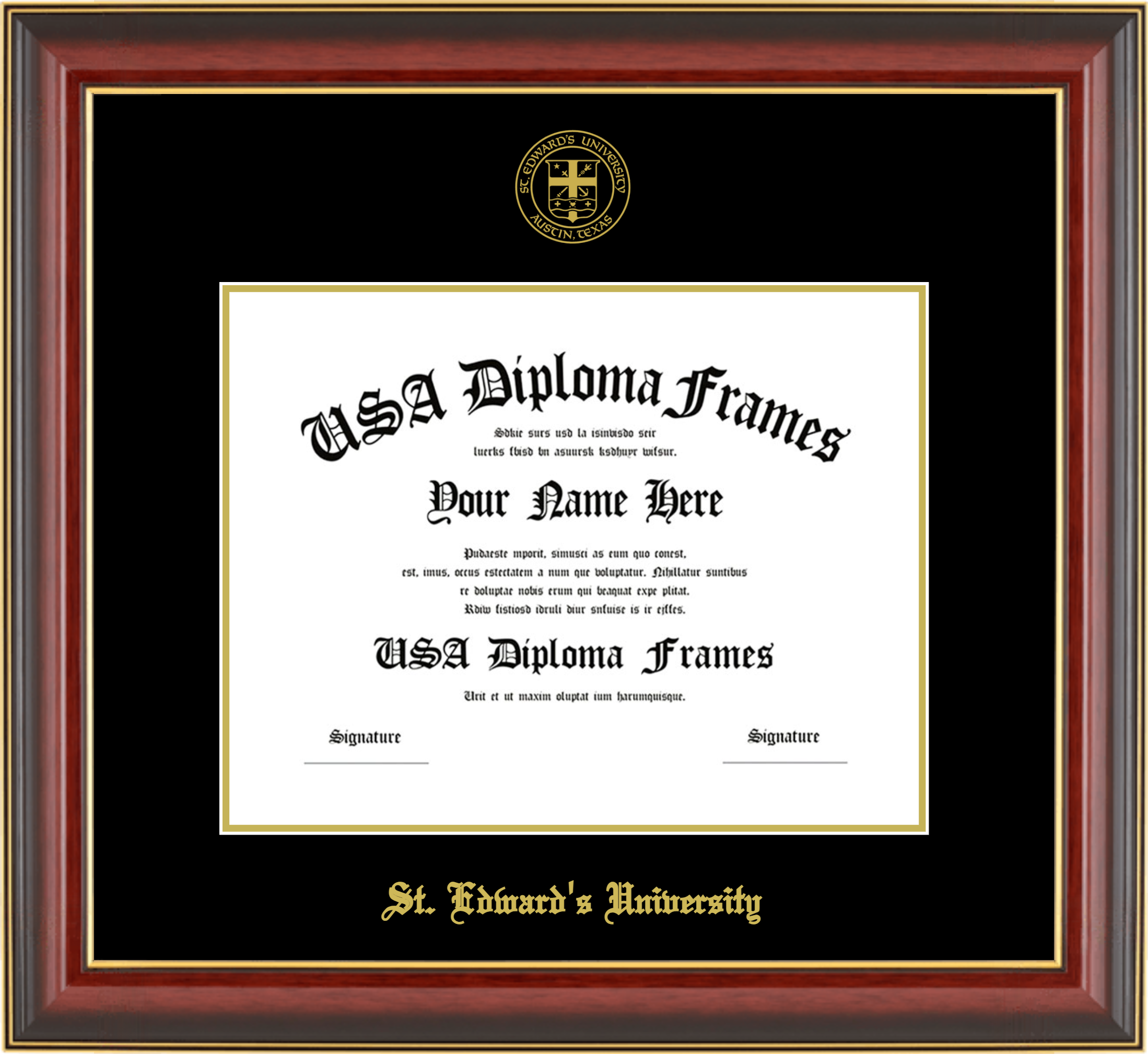 St. Edward’s University Diploma Frame – Cherry Mahogany Gold Trim Glossy – Black and Gold Mat