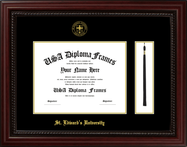 St. Edward’s University Diploma Frame with Tassel – Executive Cherry Rope – Black and Gold Mat