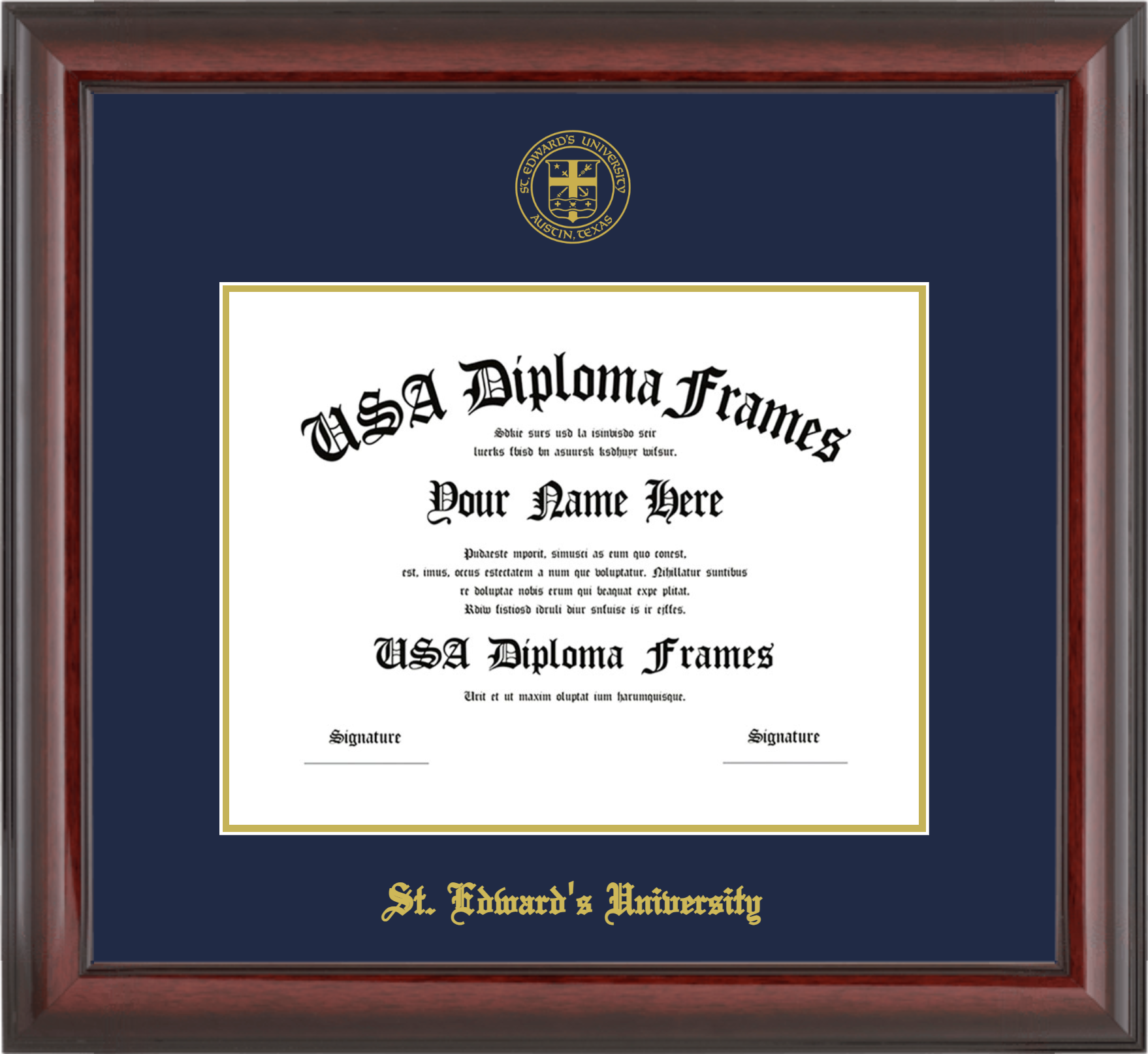 St. Edward’s University – Single Horizontal Document ( Bachelors ) – Cherry Mahogany Glossy – Navy Mat – Gold Accent Mat – With Seal(University Seal Gold) – With Gold Embossing (St. Edward’s University)