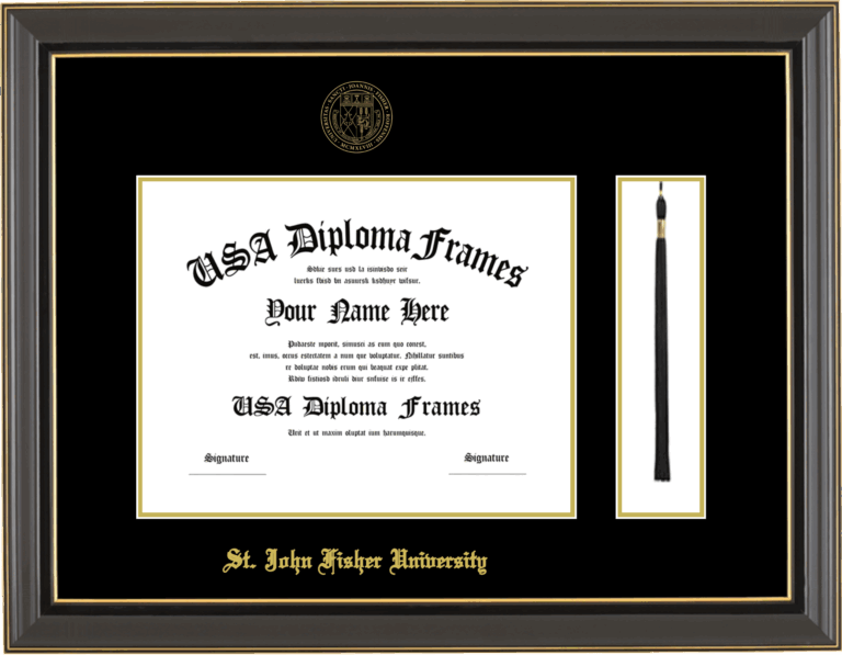 St. John Fisher University Diploma Frame with Tassel – Black Gold Trim Glossy – Black and Gold Mat