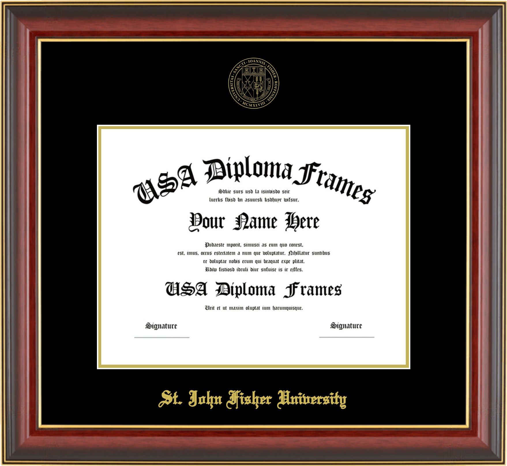 St. John Fisher University Diploma Frame- Cherry Mahogany Gold Trim Glossy – Black and Gold Mat
