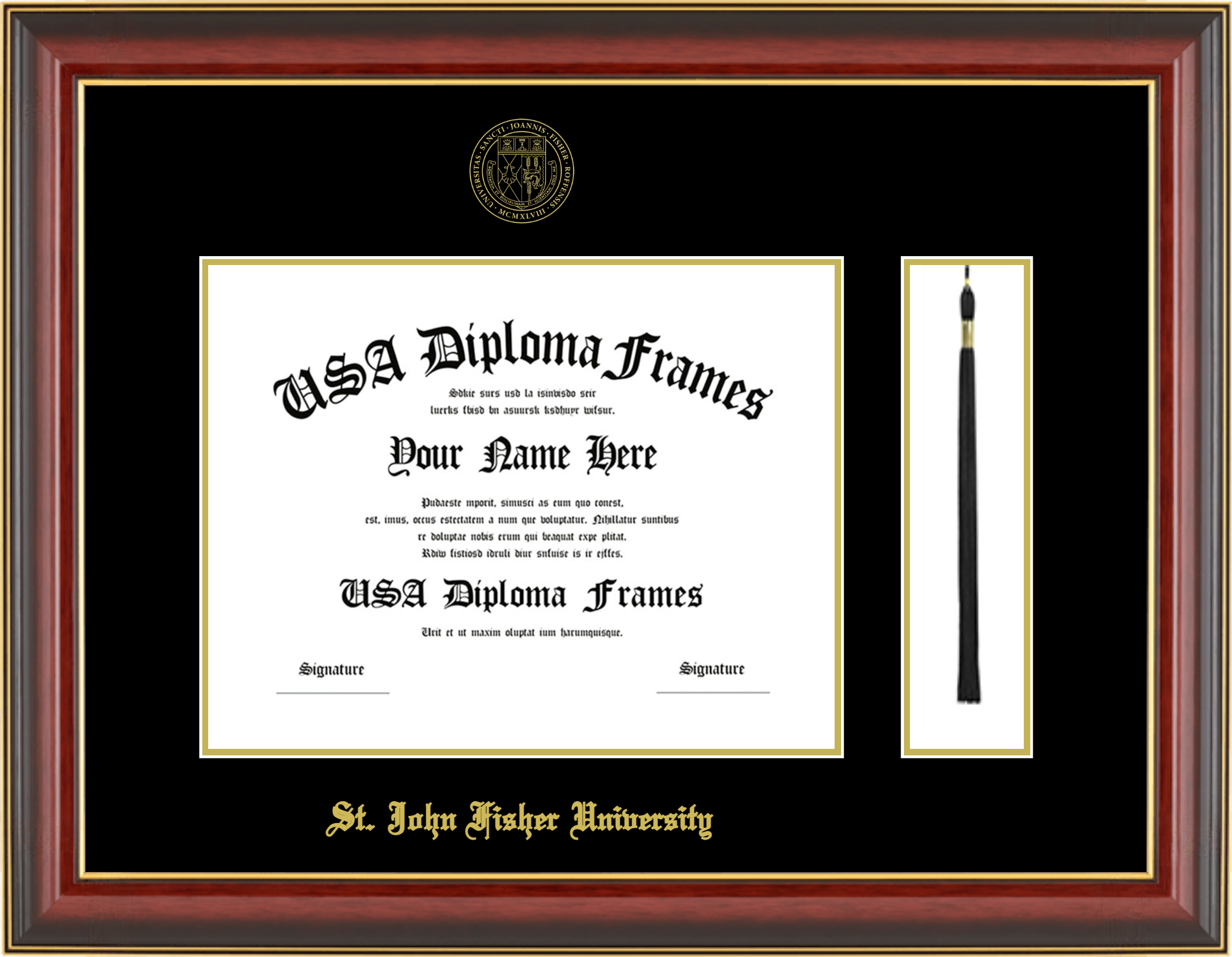 St. John Fisher University Diploma Frame with Tassel – Cherry Mahogany Gold Trim Glossy – Black and Gold Mat