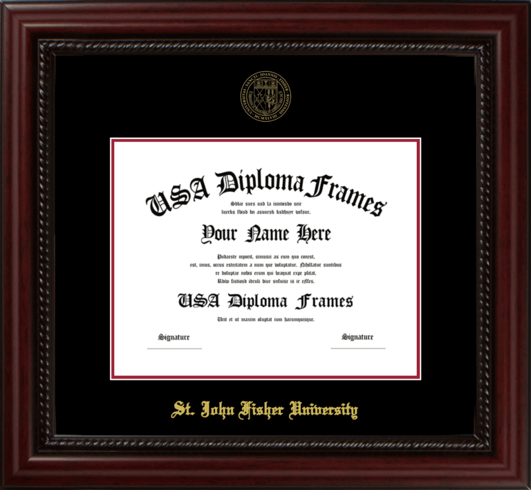 St. John Fisher University Diploma Frame – Executive Cherry Rope – Black and Crimson Mat