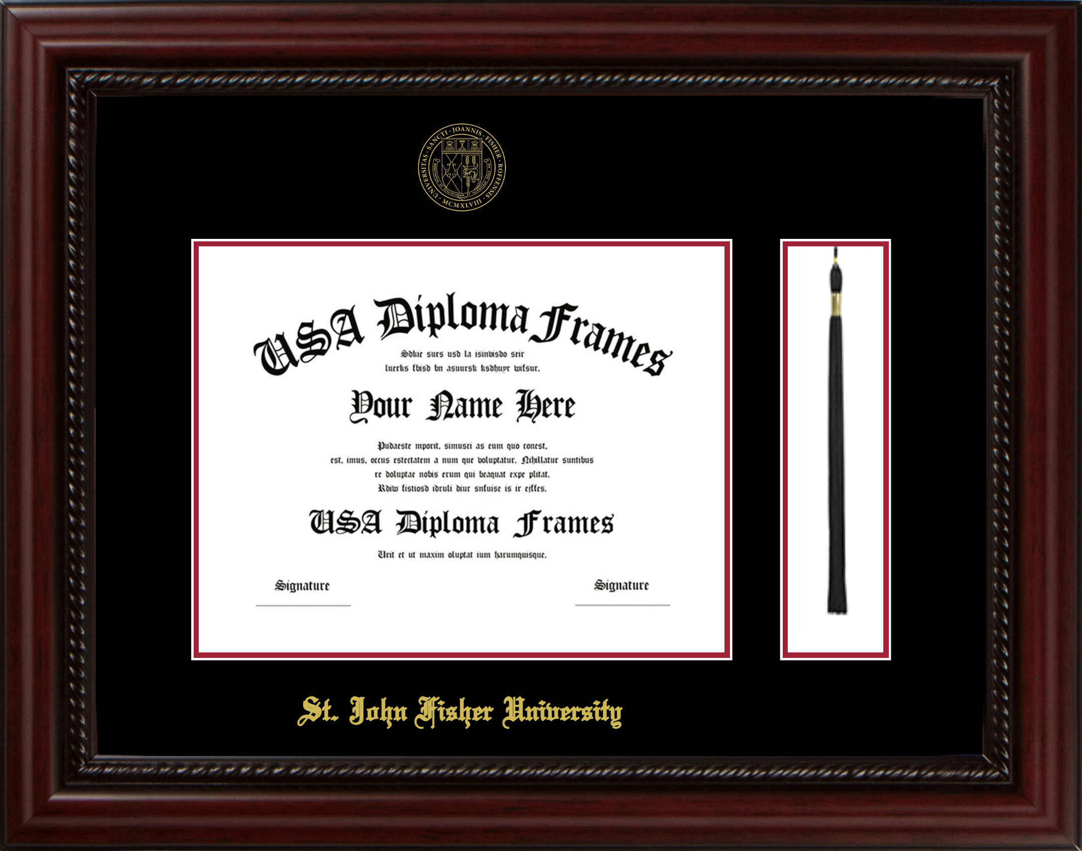 St. John Fisher University Diploma Frame with Tassel – Executive Cherry Rope – Black and Crimson Mat