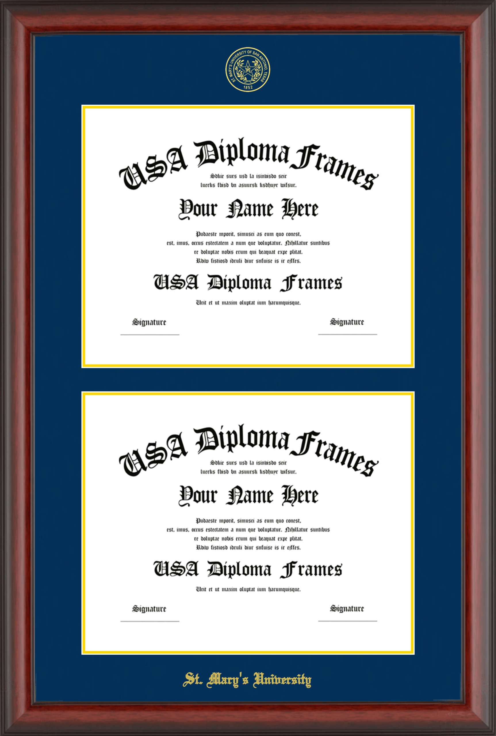 St. Mary’s University (TX) Double Diploma Frame – Double Document – Cherry Mahogany Matte – Navy and Yellow Gold Mat