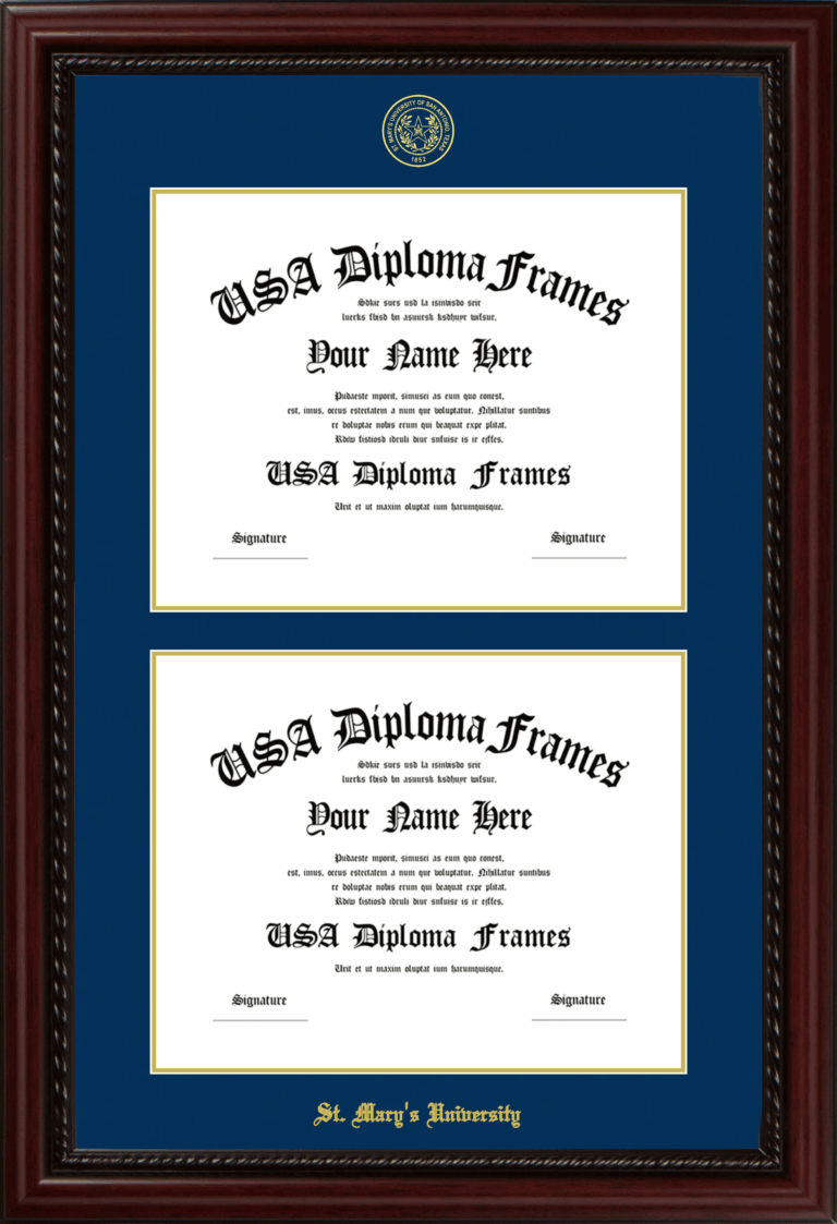 St. Mary’s University (TX) Double Diploma Frame – Double Document – Executive Cherry Rope – Navy and Gold Mat