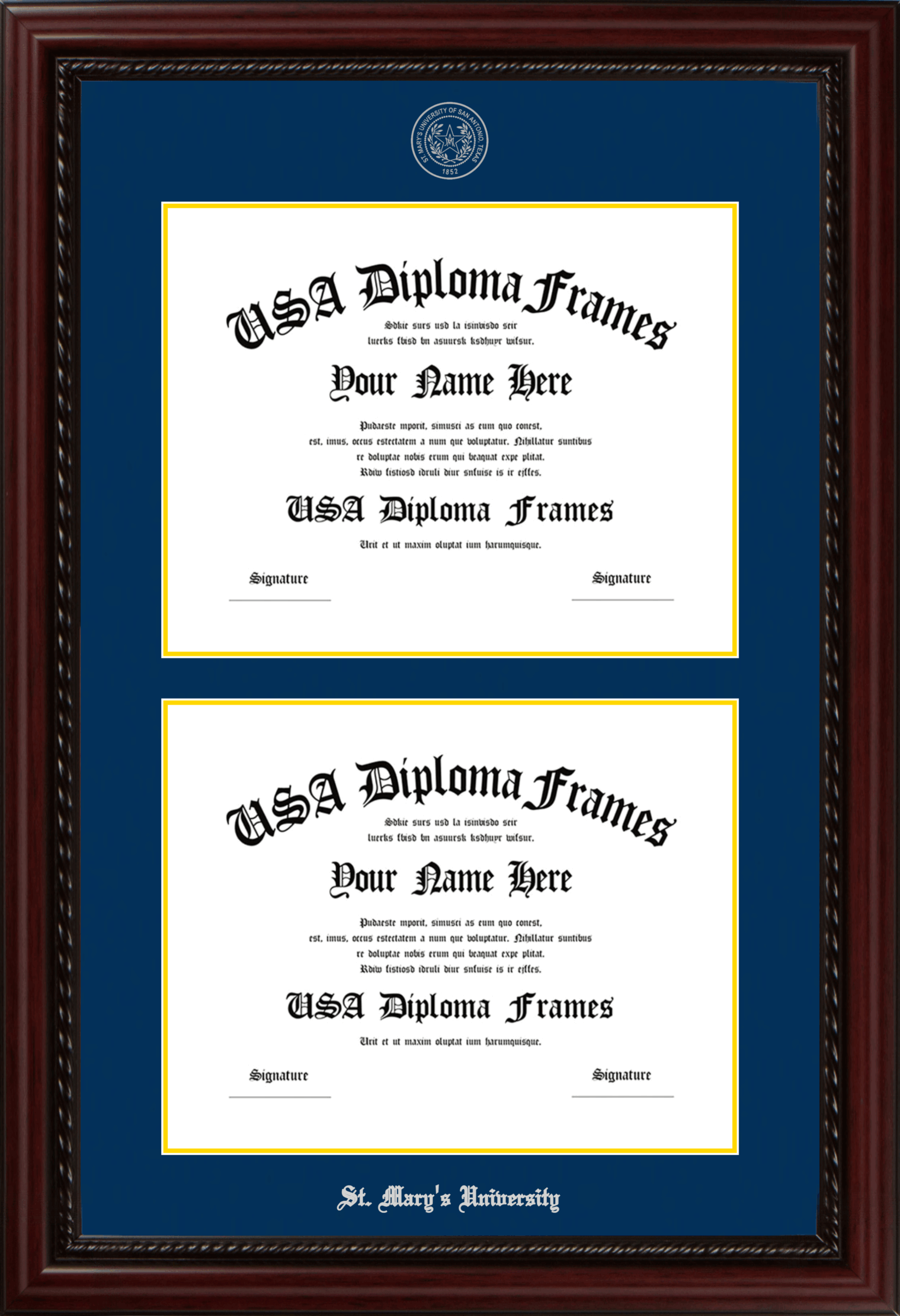 St. Mary’s University (TX) Double Diploma Frame – Double Document – Executive Cherry Rope – Navy and Yellow Gold Mat