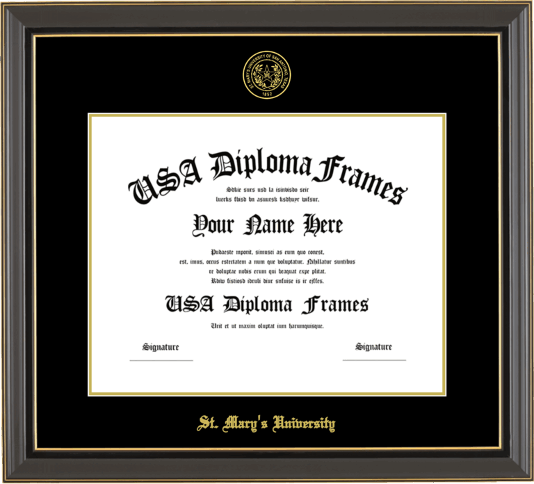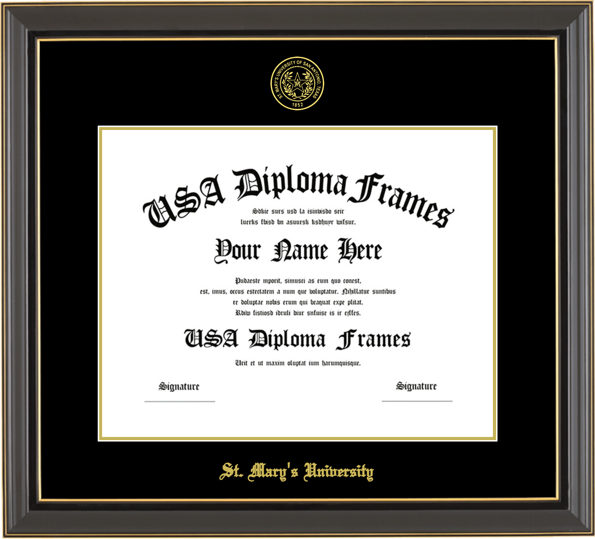 St. Mary’s University Diploma Frame – Black Gold Trim Glossy – Black and Gold Mat