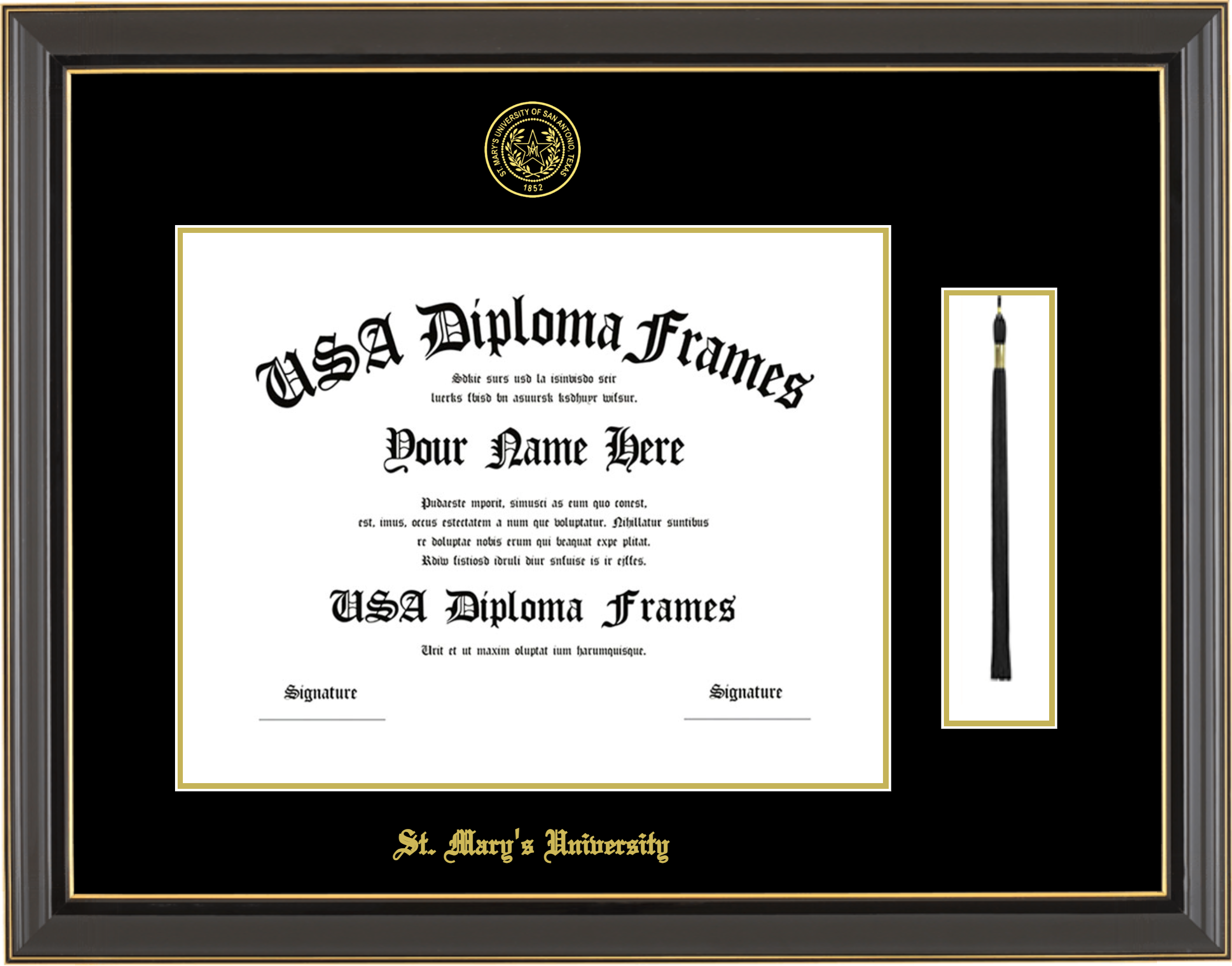 St. Mary’s University (TX) Diploma Frame with Tassel – Black Gold Trim Glossy – Black and Gold Mat