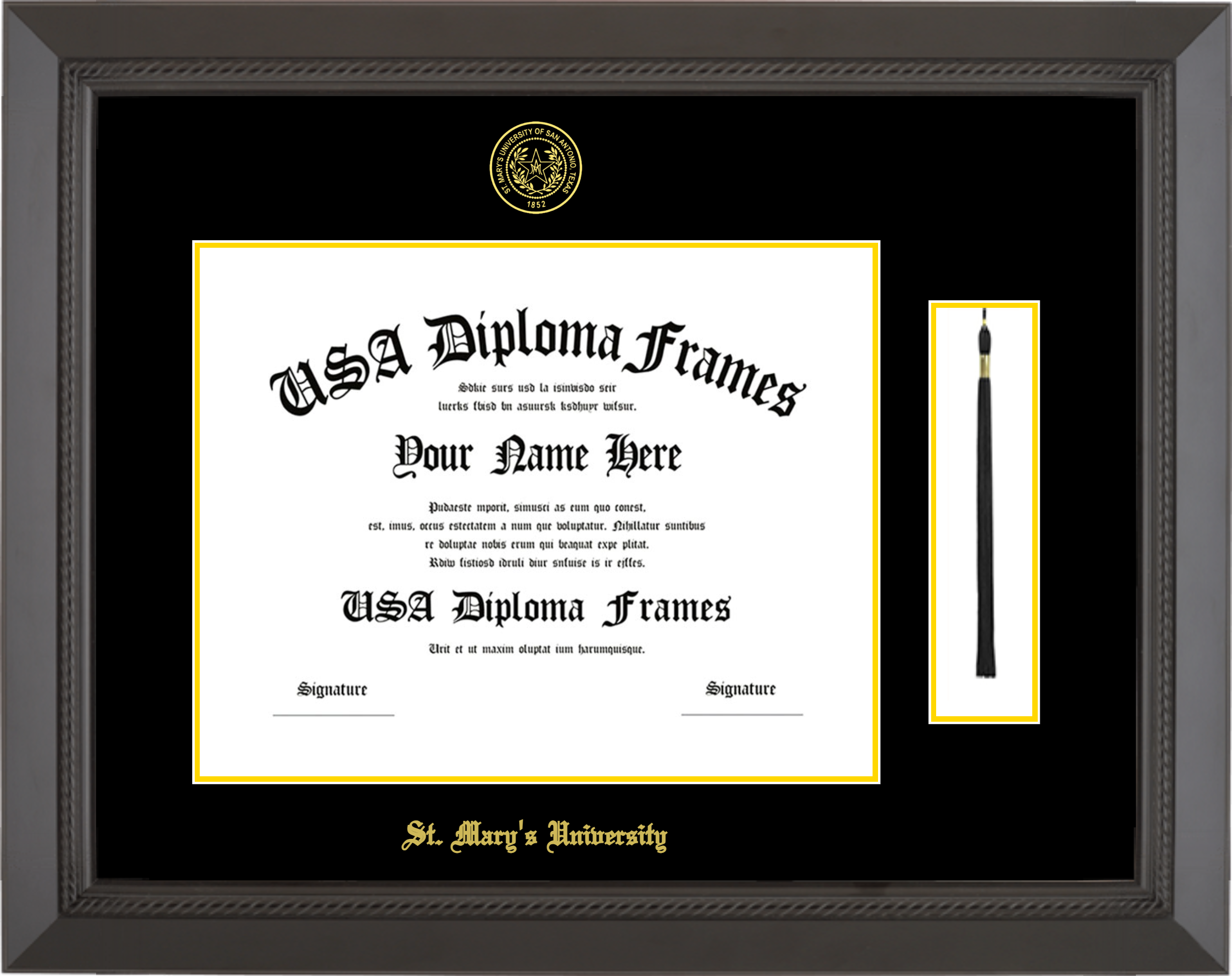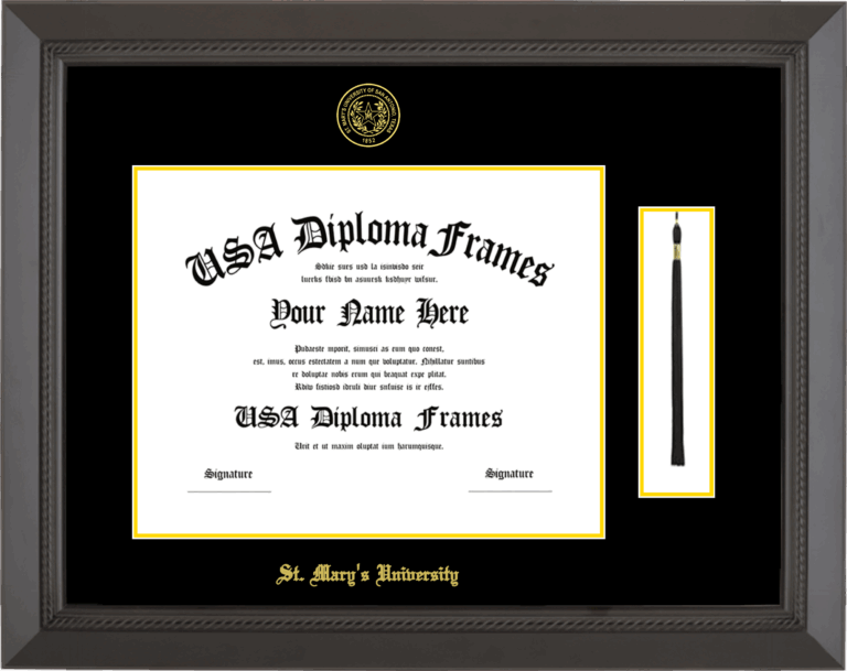 St. Mary’s University Diploma Frame with Tassel – Black Rope – Black and Yellow Gold Mat
