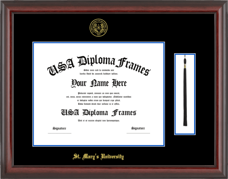 St. Mary’s University Diploma Frame with Tassel – Cherry Mahogany Glossy – Black and Royal Blue Mat