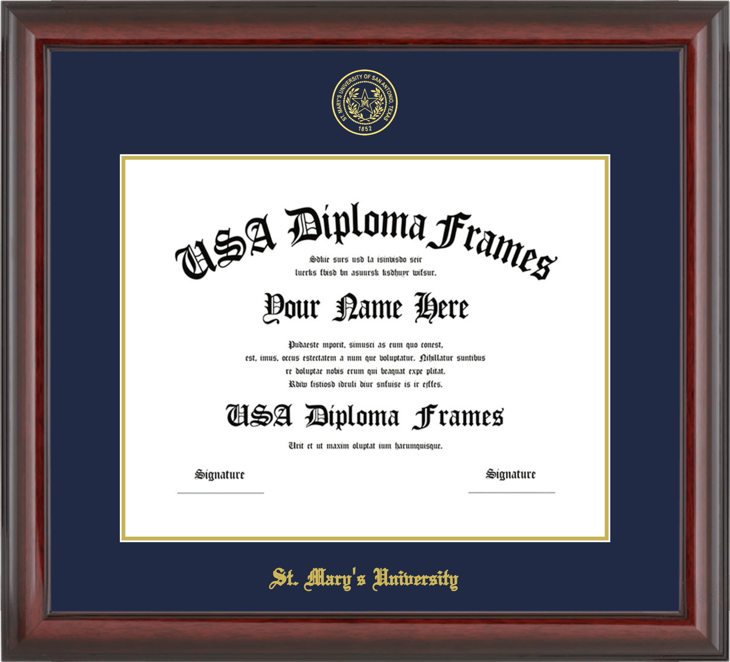 St. Mary’s University (TX) – Single Horizontal Document ( Diploma ) – Cherry Mahogany Glossy – Navy Mat – Gold Accent Mat – With Seal(University Seal Gold) – With Gold Embossing (St. Mary’s University)