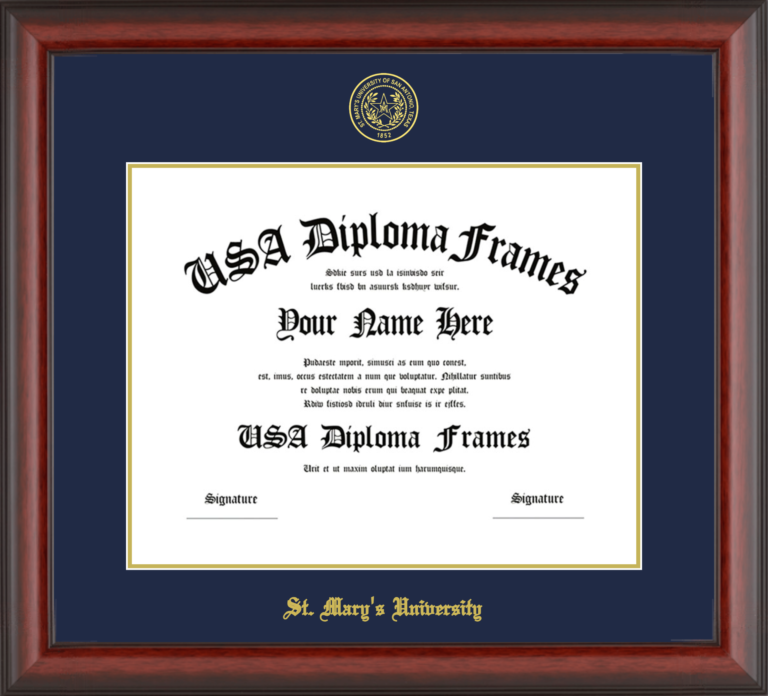 St. Mary’s University (TX) – Single Horizontal Document ( Diploma ) – Cherry Mahogany Matte – Navy Mat – Gold Accent Mat – With Seal(University Seal Gold) – With Gold Embossing (St. Mary’s University)