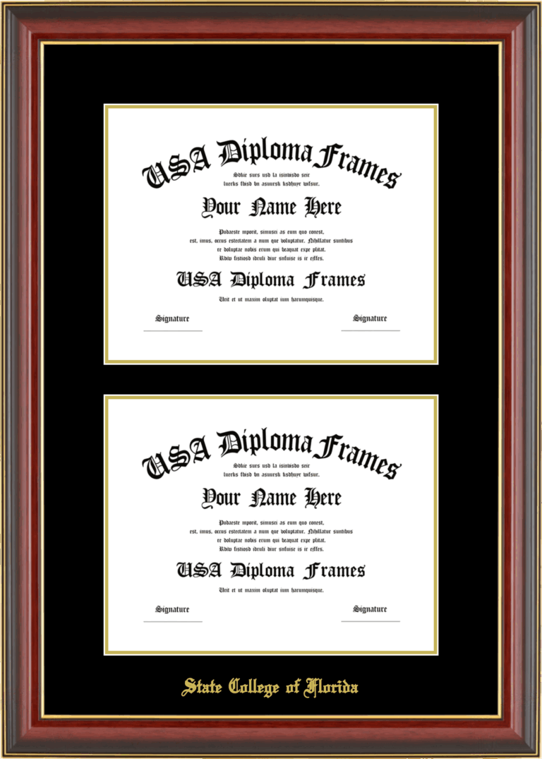 State College of Florida Double Diploma Frame – Double Document – Cherry Mahogany Gold Trim Glossy – Black and Gold Mat