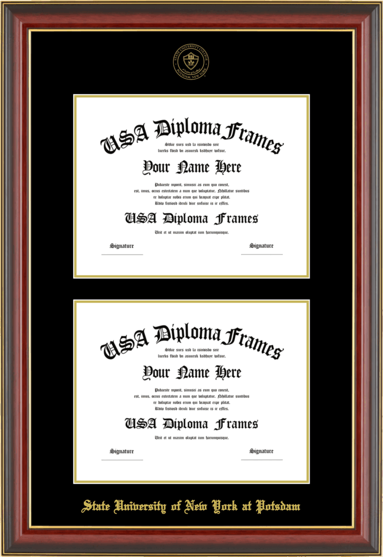 State University of New York College at Potsdam Double Diploma Frame – Double Document – Cherry Mahogany Gold Trim Glossy – Black and Gold Mat