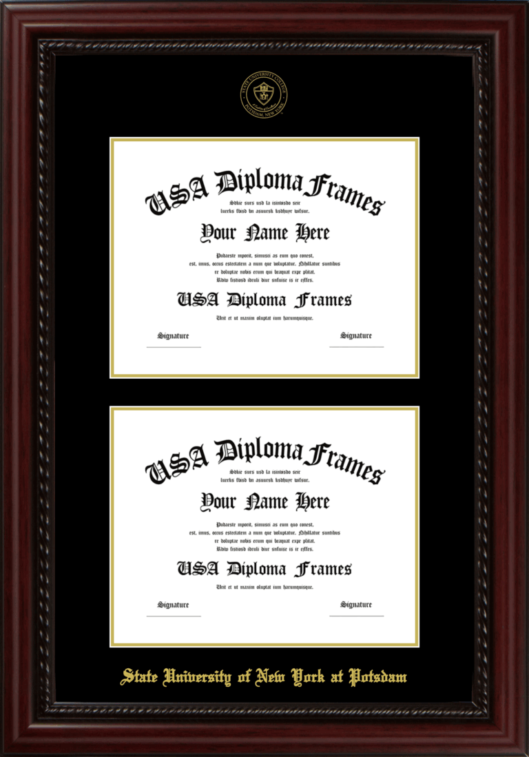 State University of New York College at Potsdam Double Diploma Frame – Double Document – Executive Cherry Rope – Black and Gold Mat