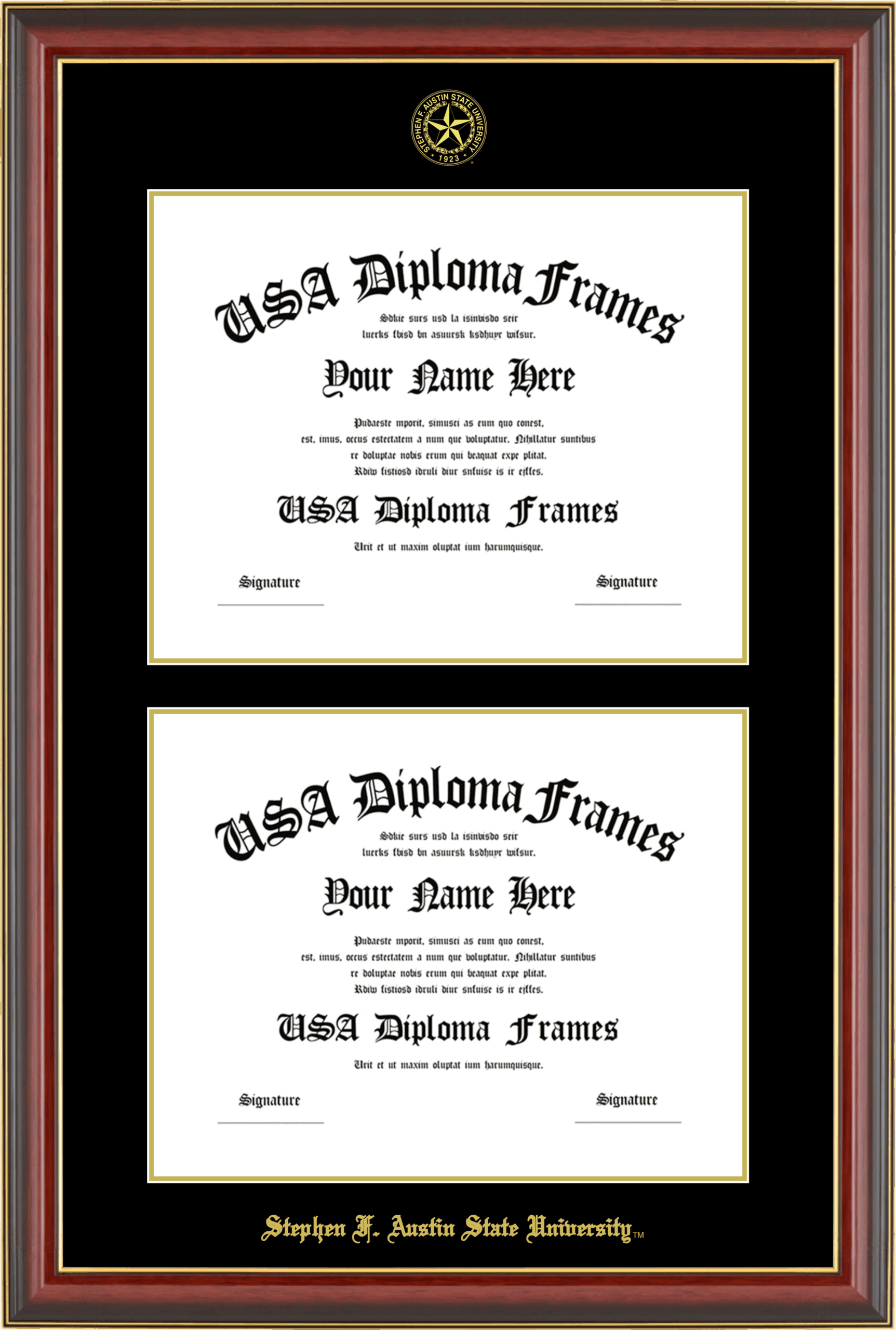Stephen F. Austin State University SFA Double Diploma Frame – Double Document – Cherry Mahogany Gold Trim Glossy – Black and Gold Mat – Gold Seal