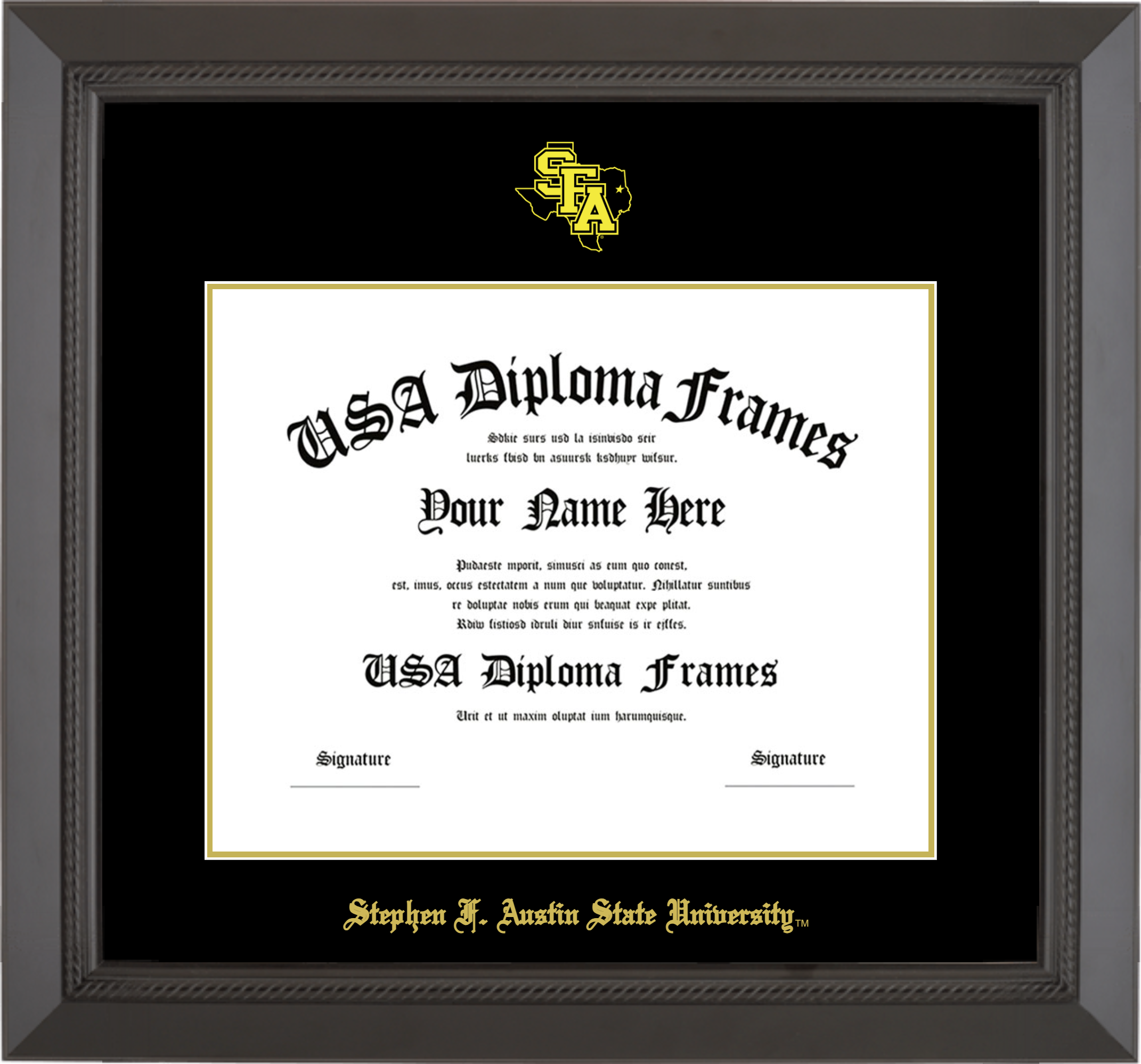 Stephen F. Austin State University Diploma Frame – Black Rope – Black and Gold Mat – Gold Athletic Seal